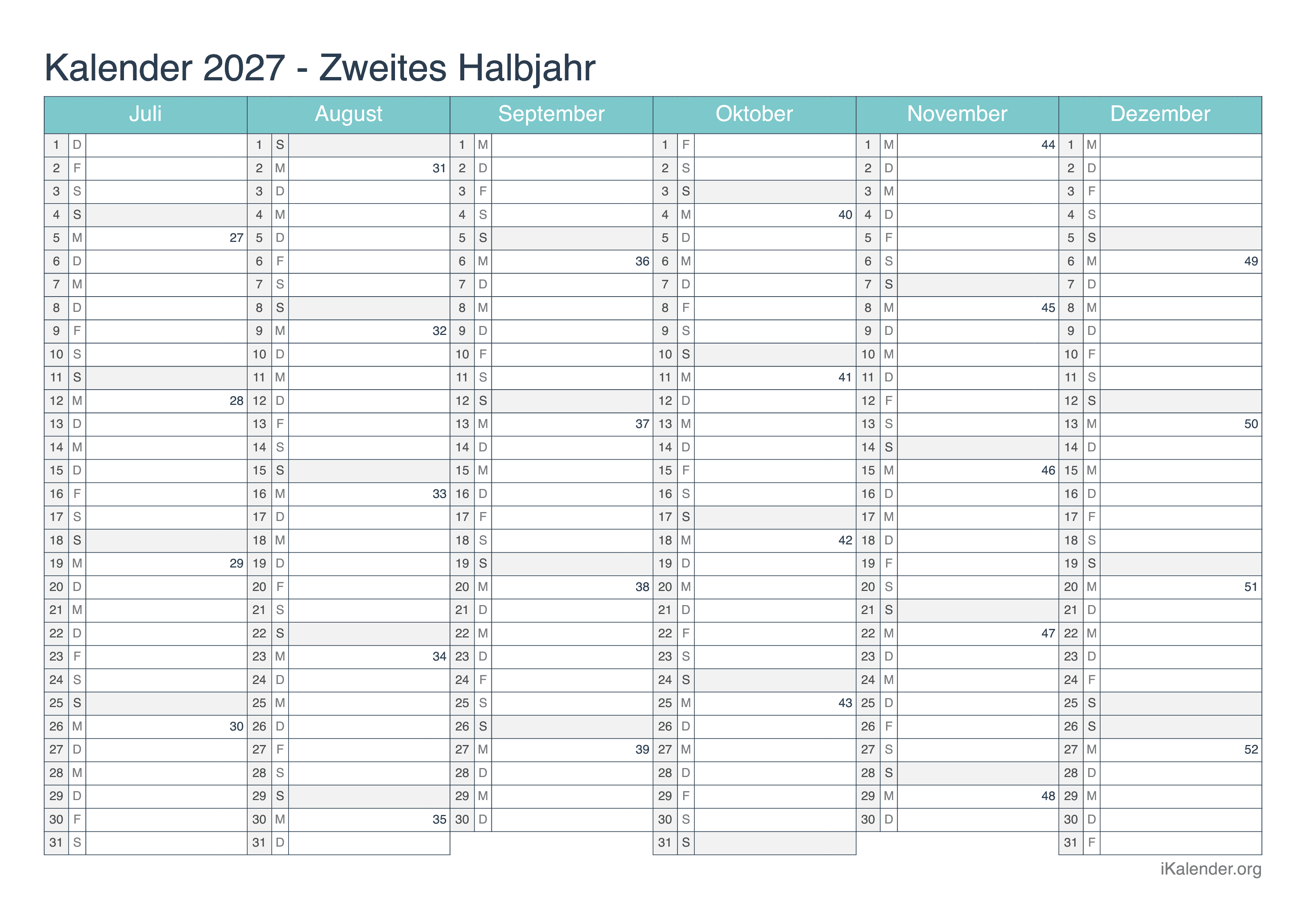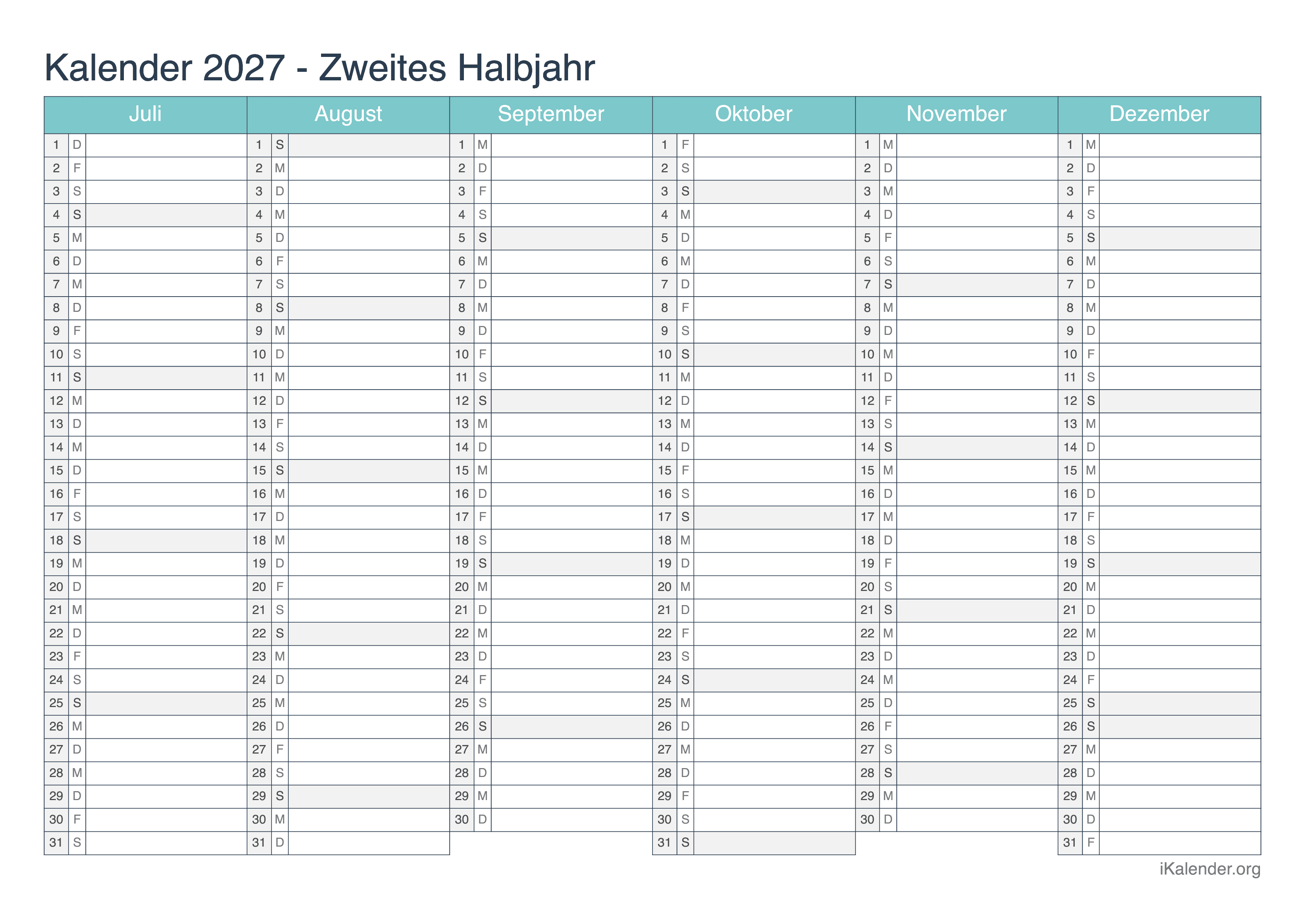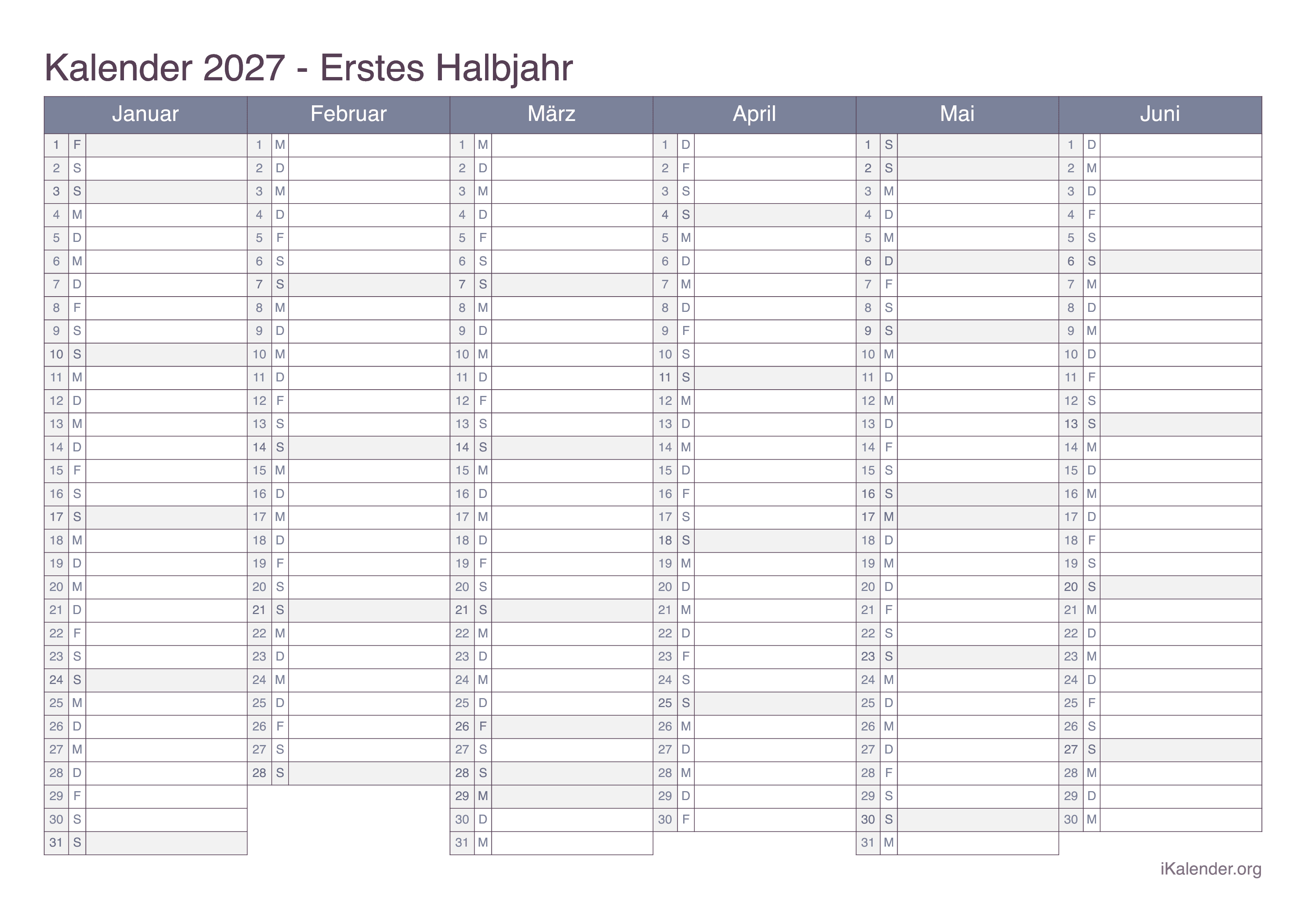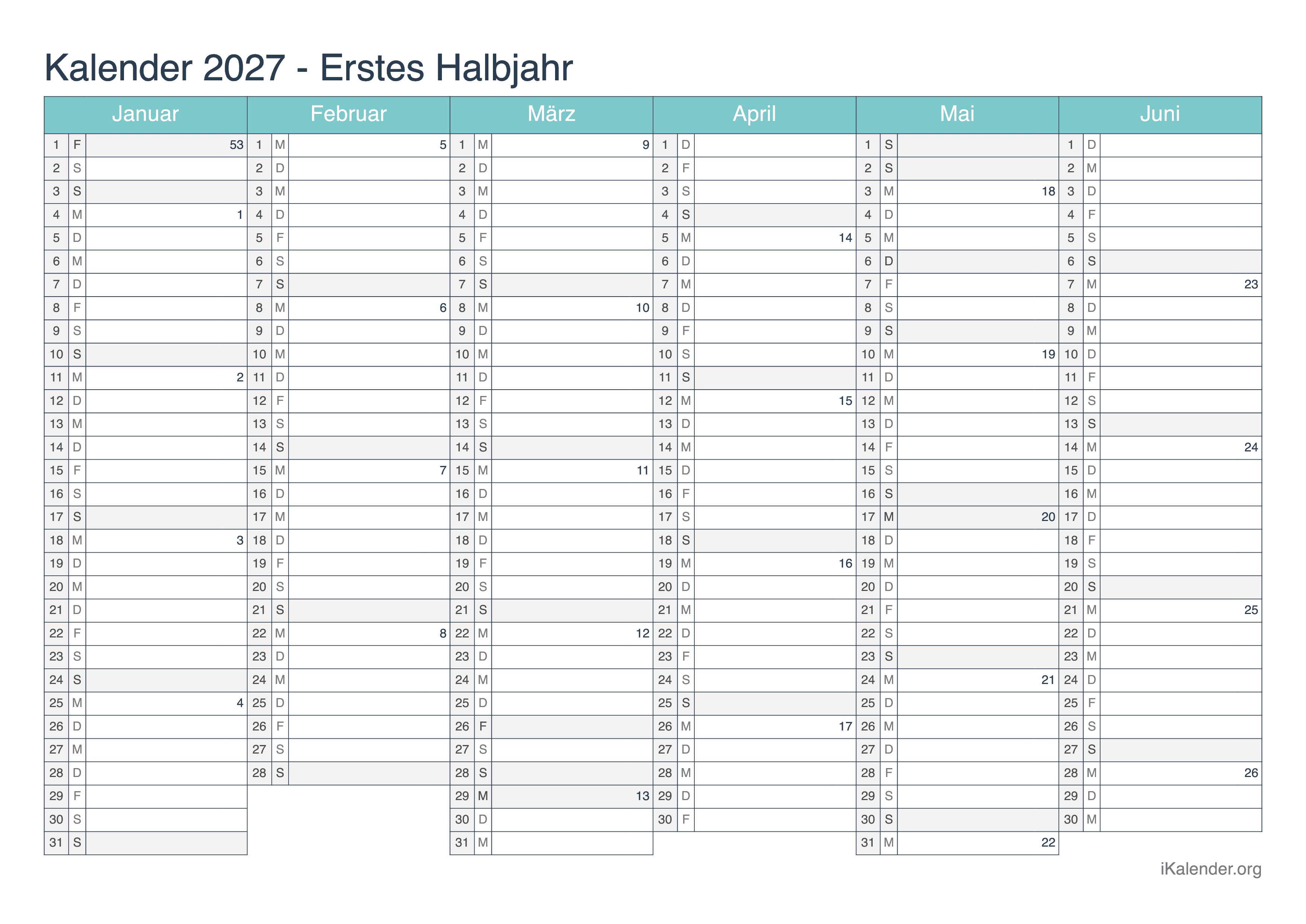 Wir bieten diese Halbjahreskalender zum Ausdrucken an: Als Blanko-Version, eine Version mit den Wochennummern sowie eine Version mit Feiertagen und Tagesheiligen.