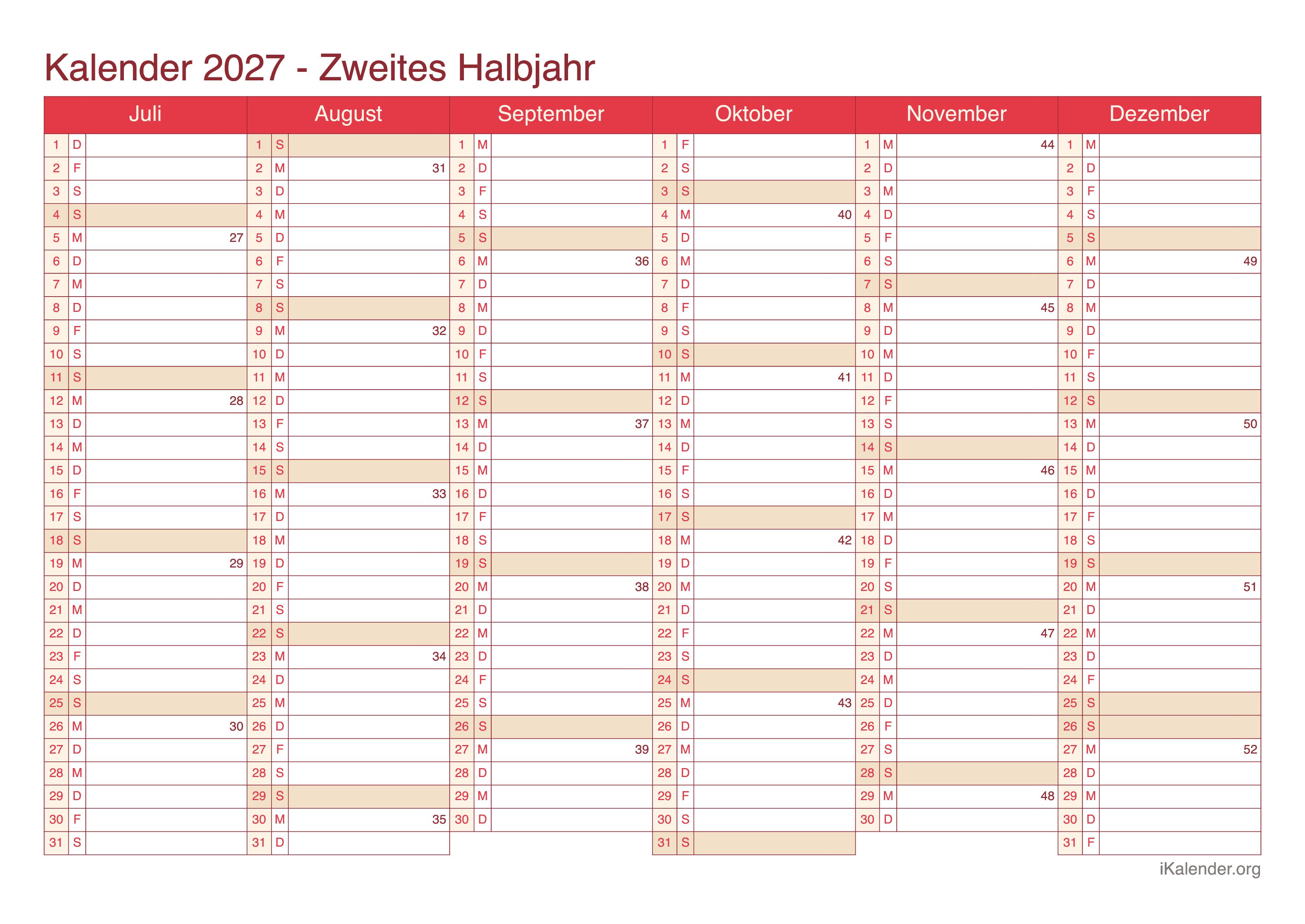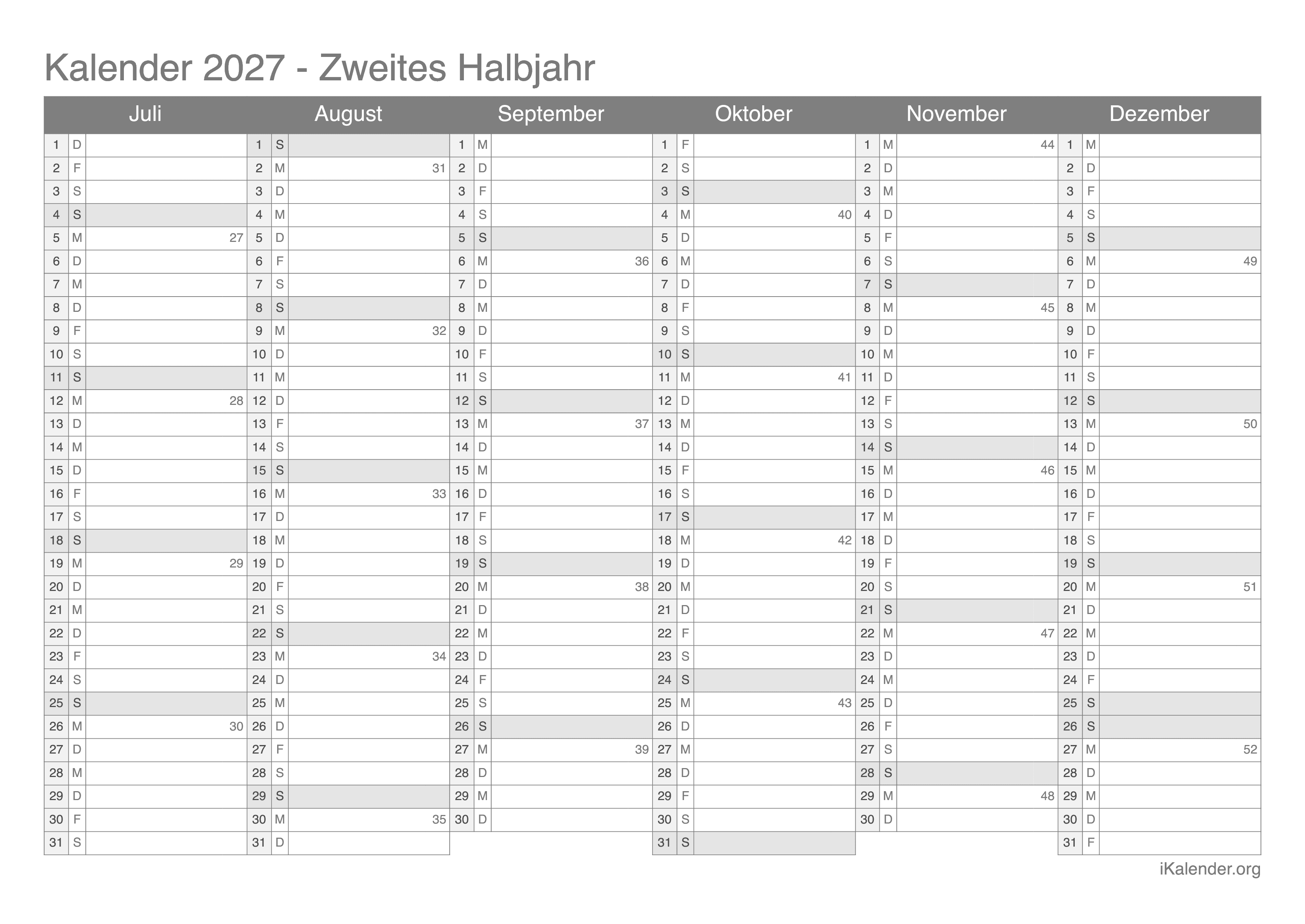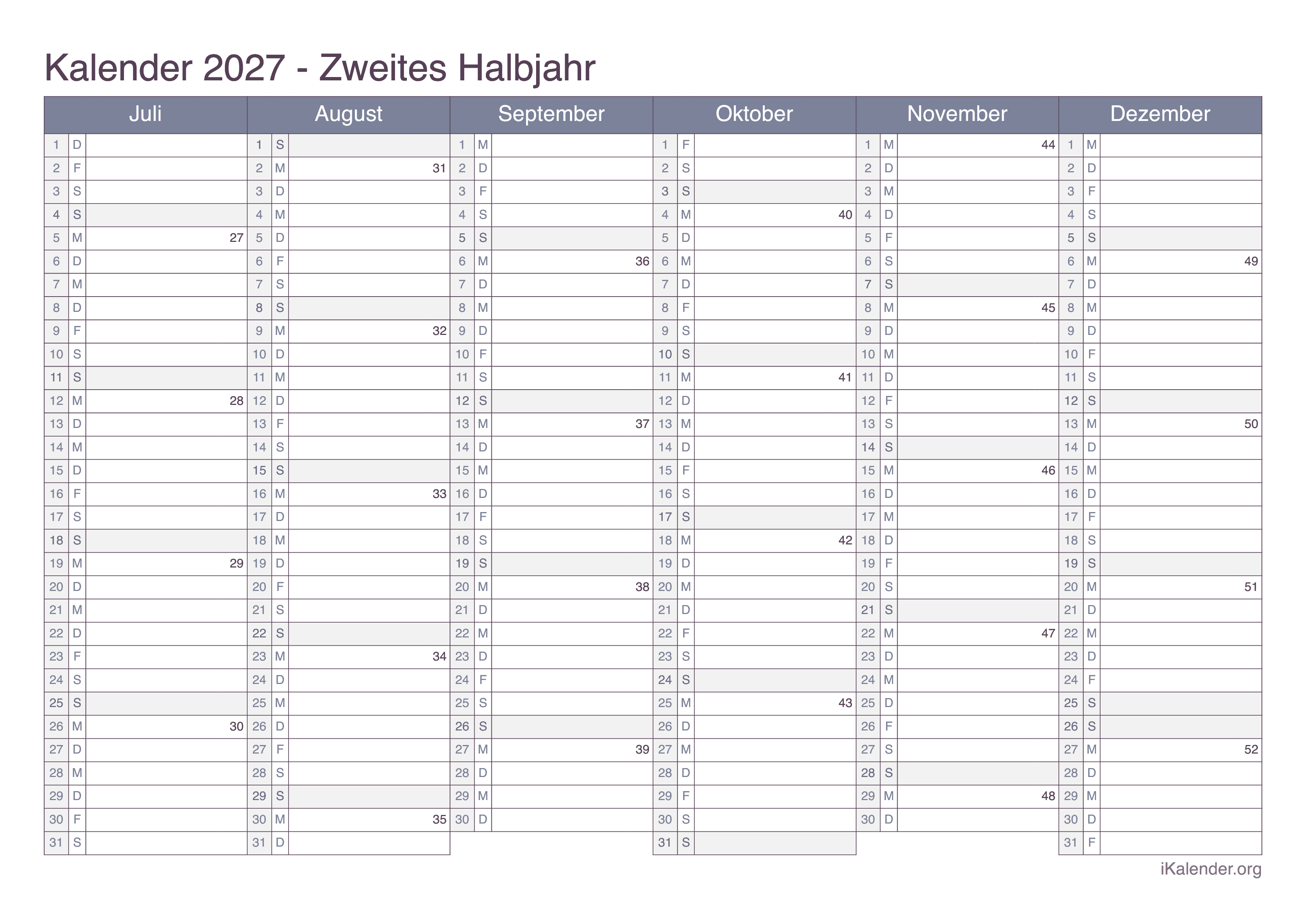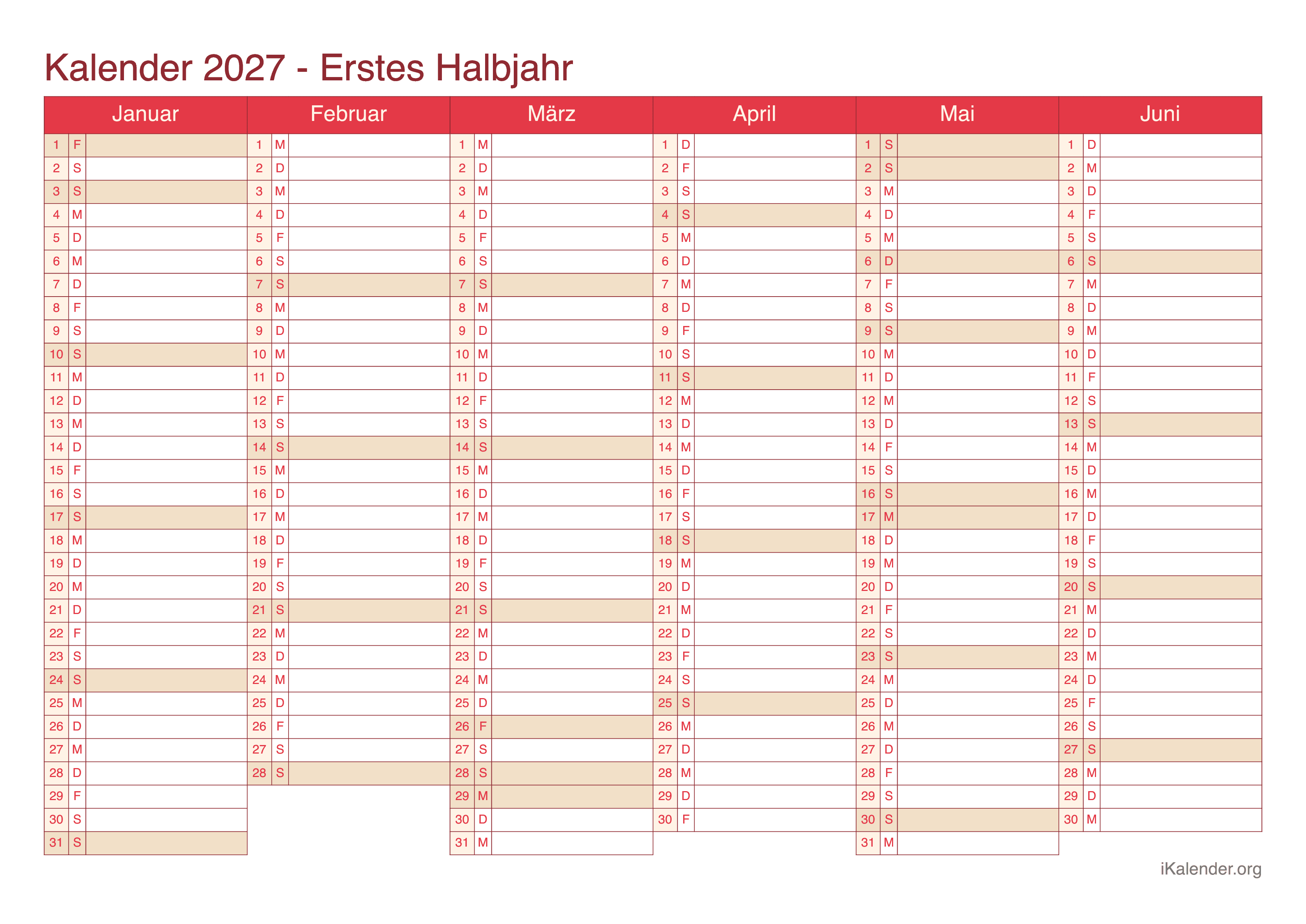 Wir bieten diese Halbjahreskalender zum Ausdrucken an: Als Blanko-Version, eine Version mit den Wochennummern sowie eine Version mit Feiertagen und Tagesheiligen.