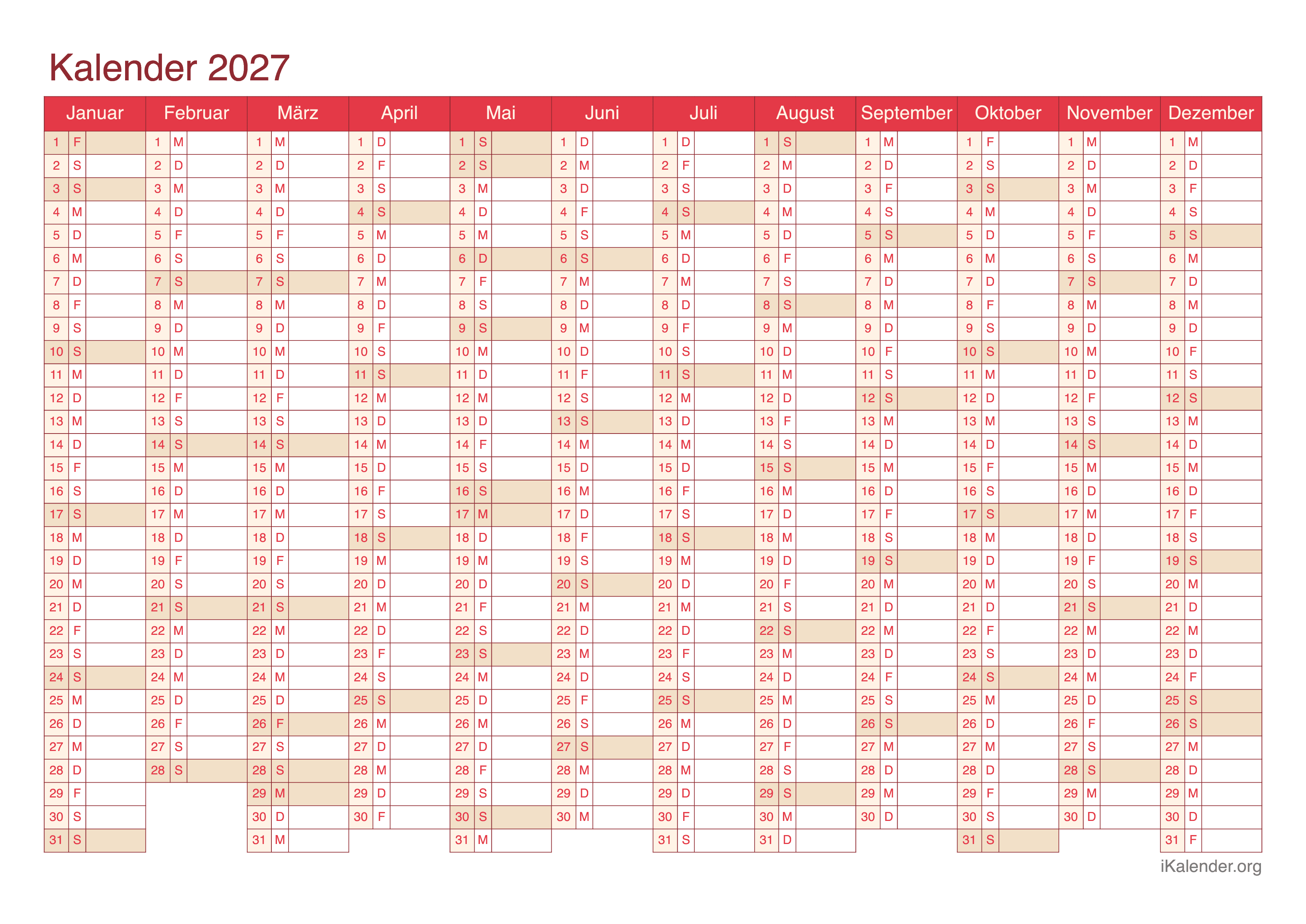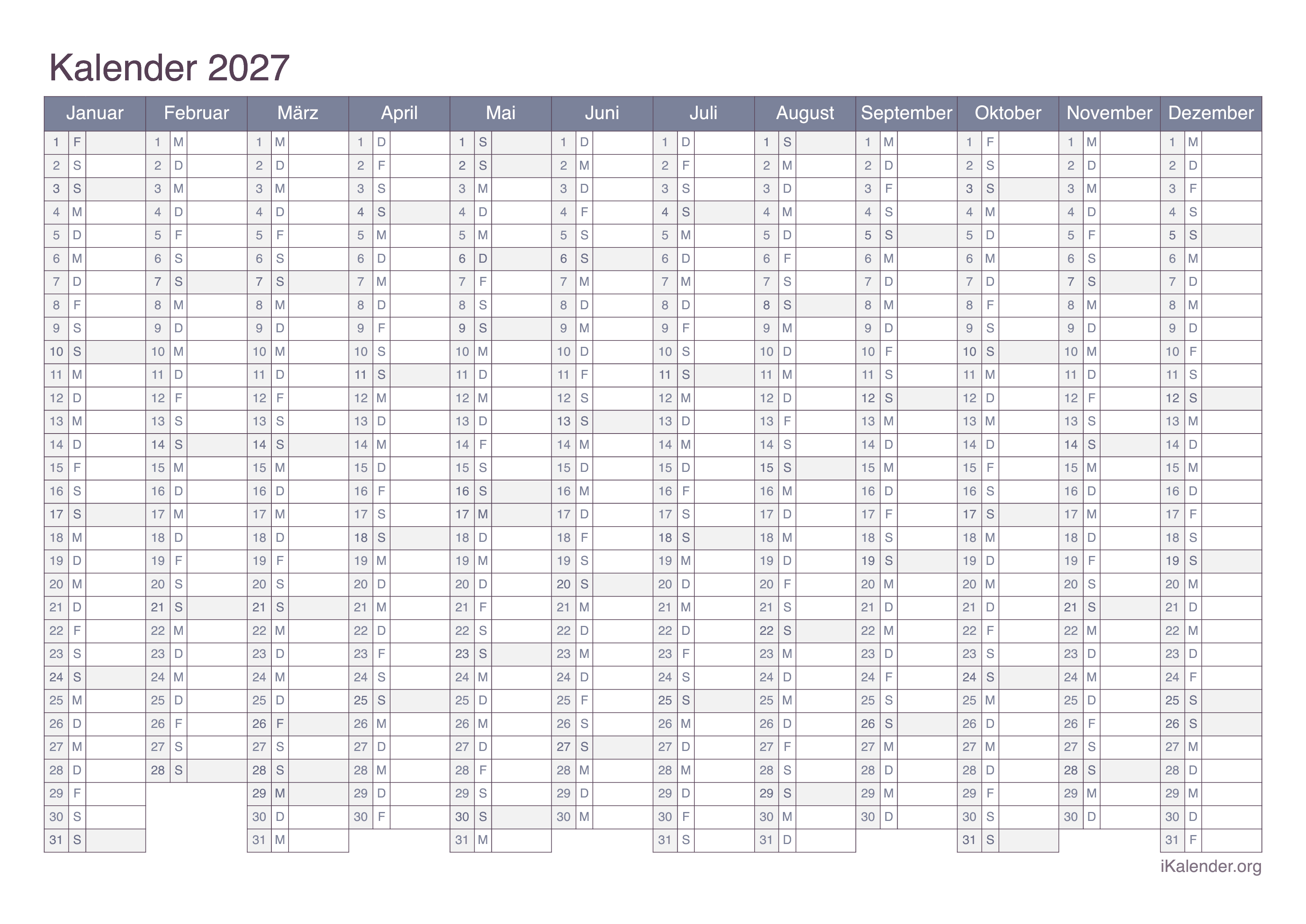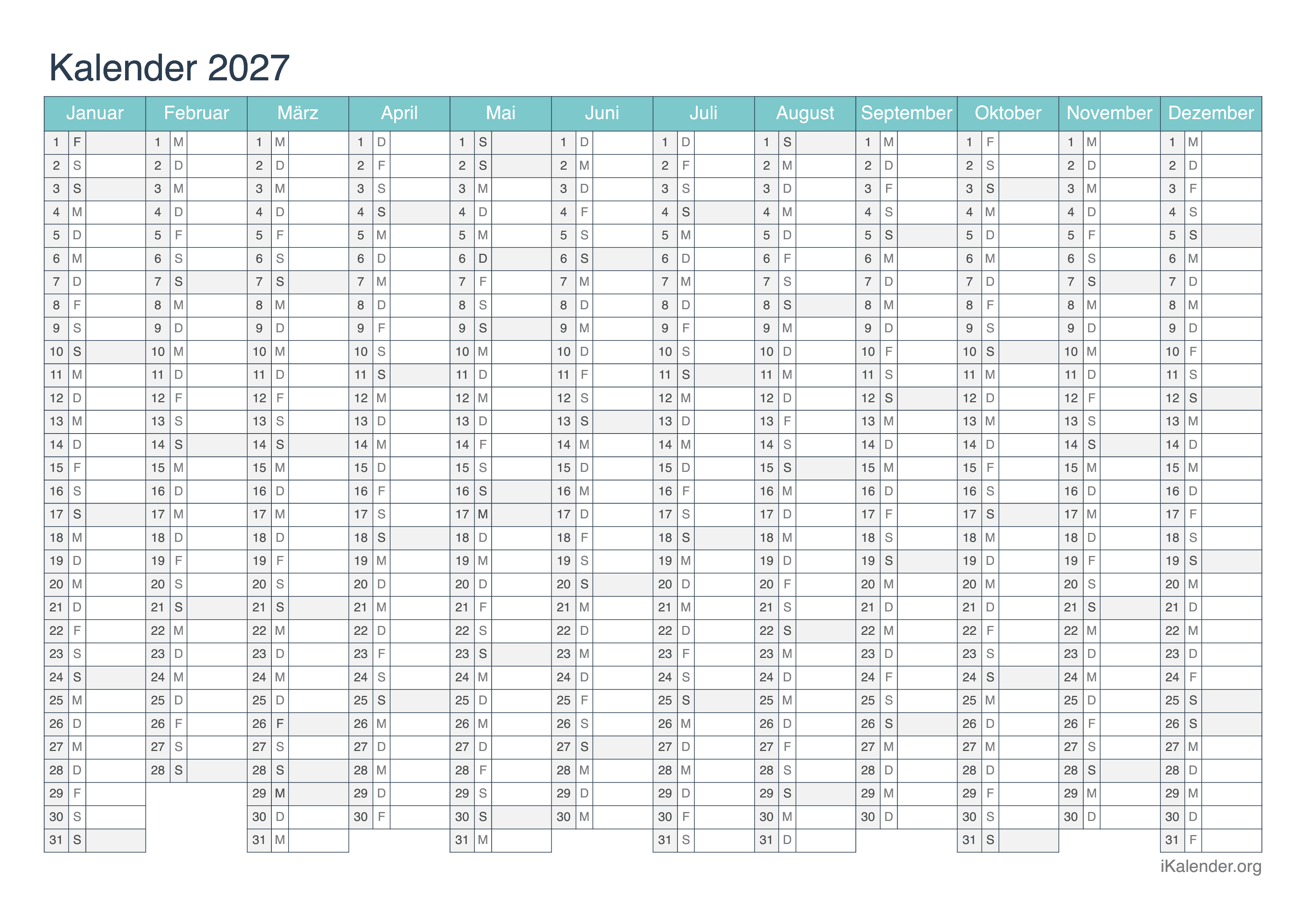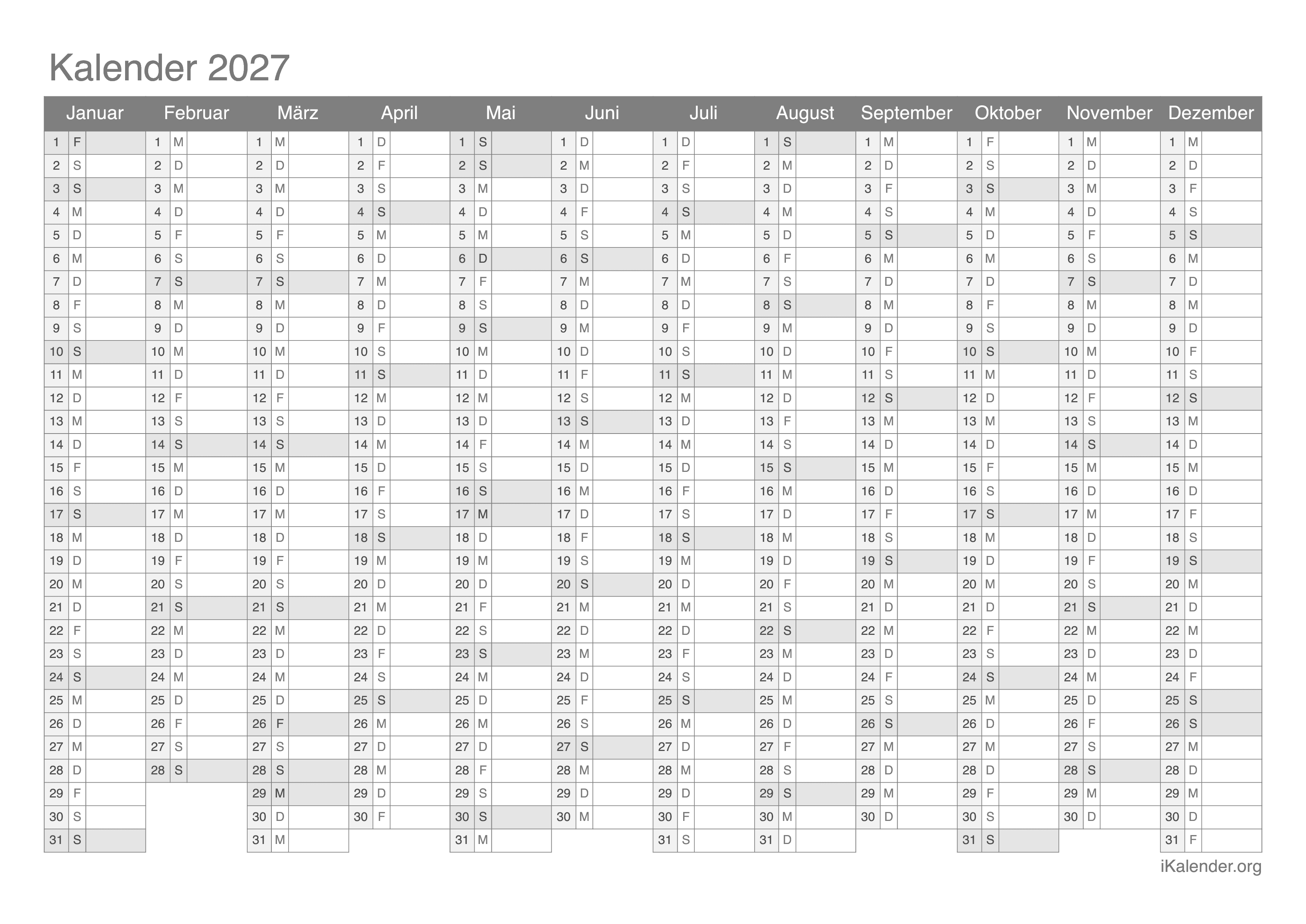 Unsere Kalender sind lizenzfrei, und können direkt heruntergeladen und ausgedruckt werden. Der folgende Kalender enthält das gesamte Jahr auf einer Seite und ist im Bild-, PDF- und Excel-Format erhältlich.