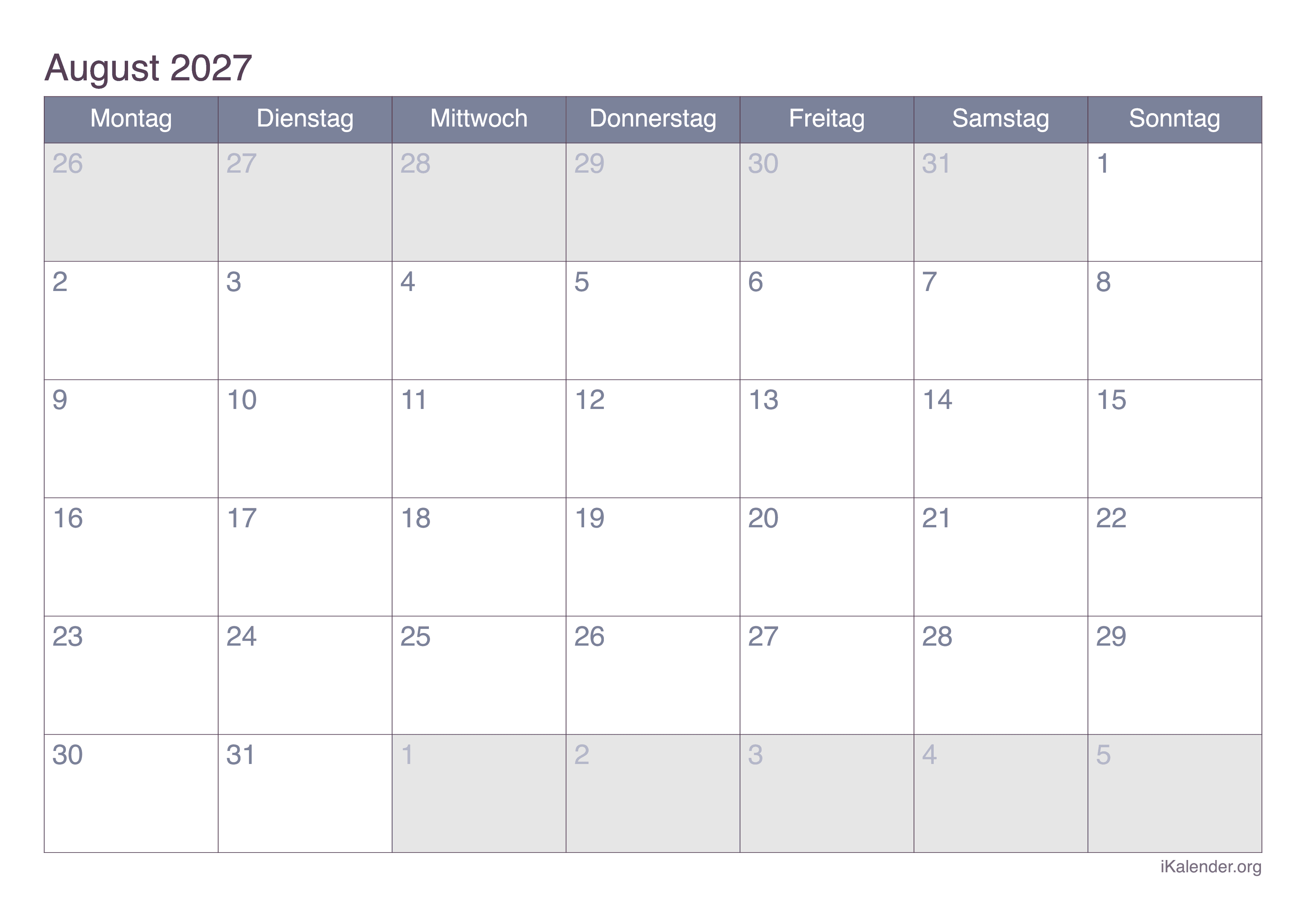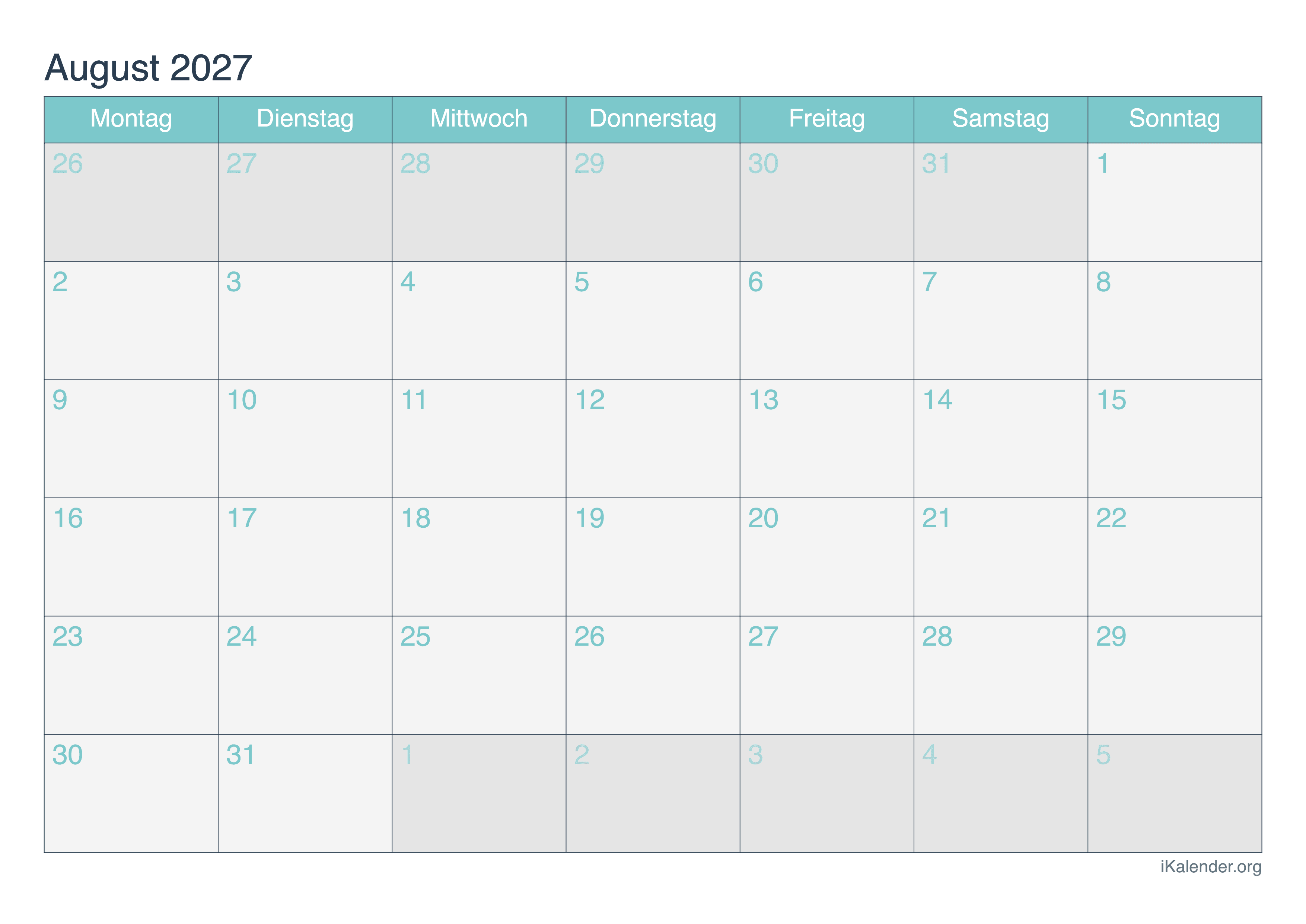 Sie können den Blanko-Kalender für August 2027 kostenlos im Bild-, PDF- und Excel-Format herunterladen und ausdrucken. Dort finden Sie auch andere Themen-Kalender 2027 für den Monat August.