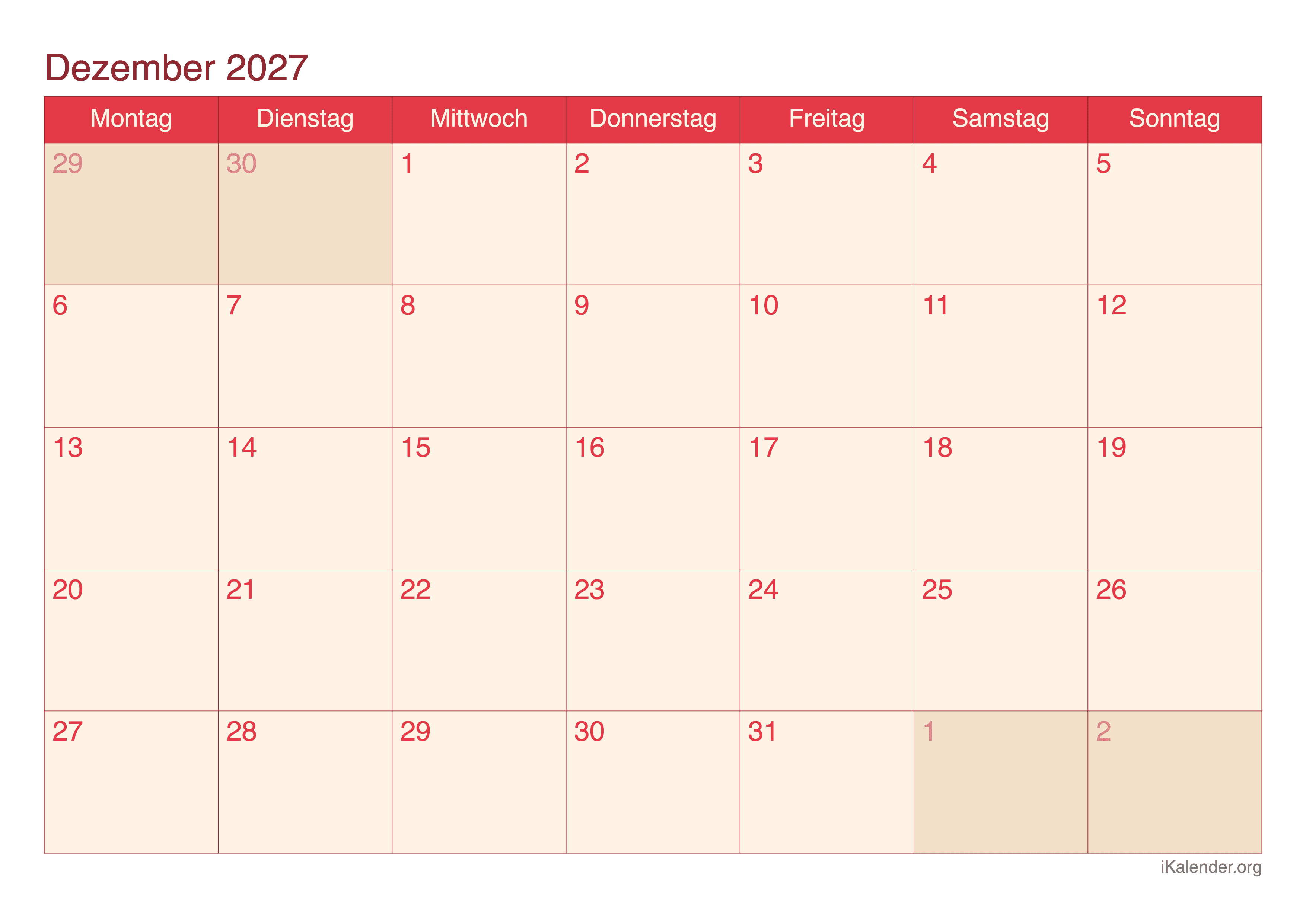 Sie können den Blanko-Kalender für Dezember 2027 kostenlos im Bild-, PDF- und Excel-Format herunterladen und ausdrucken. Dort finden Sie auch andere Themen-Kalender 2027 für den Monat Dezember.