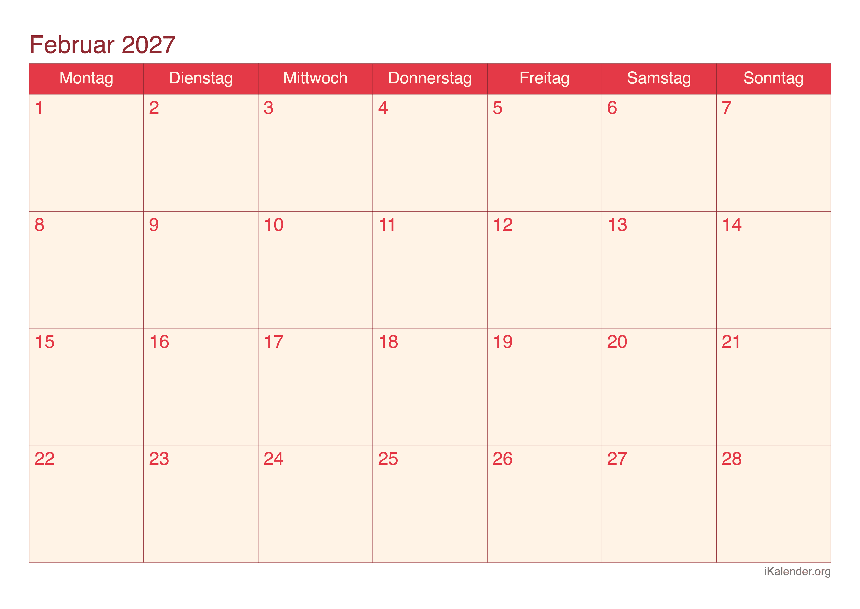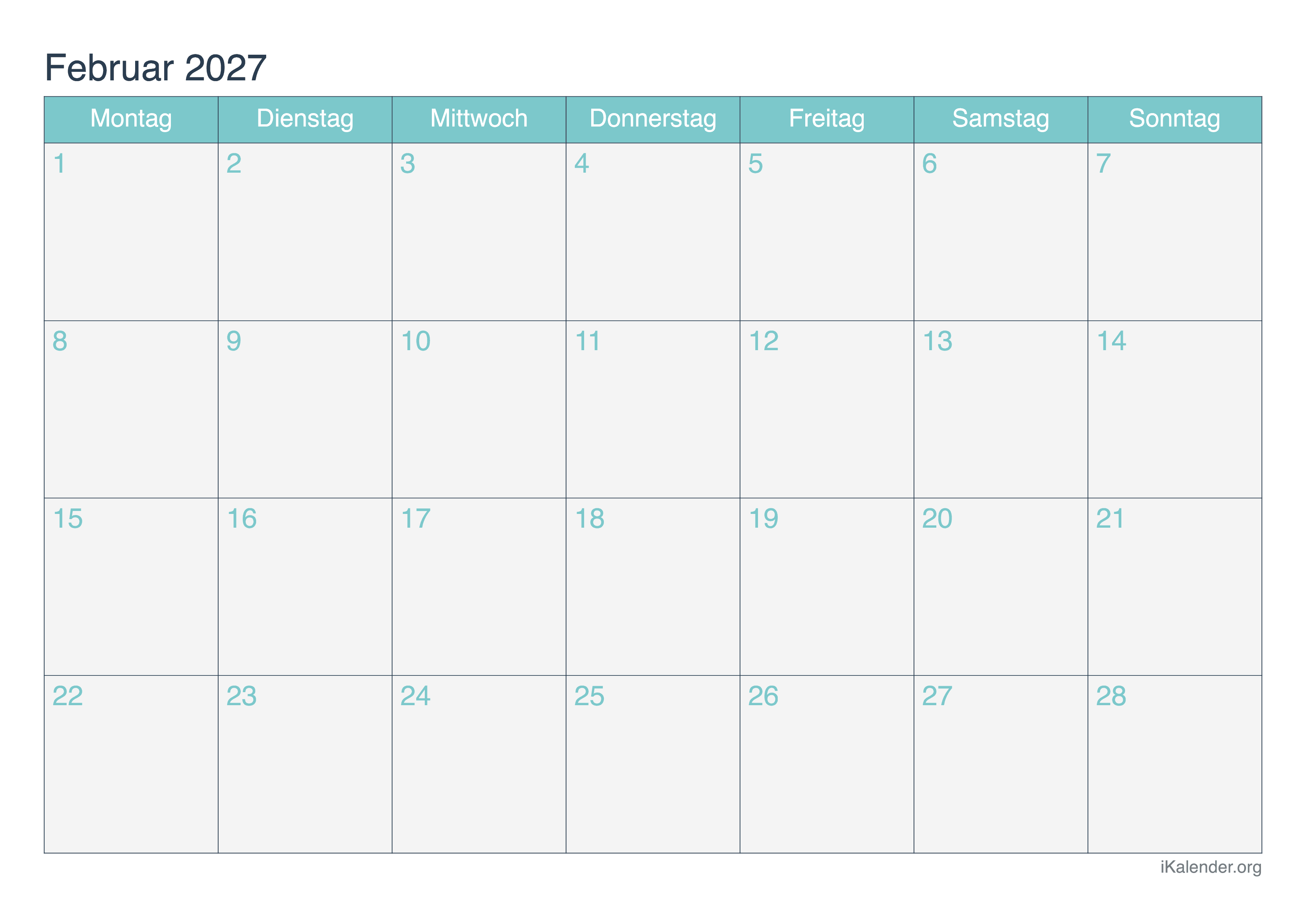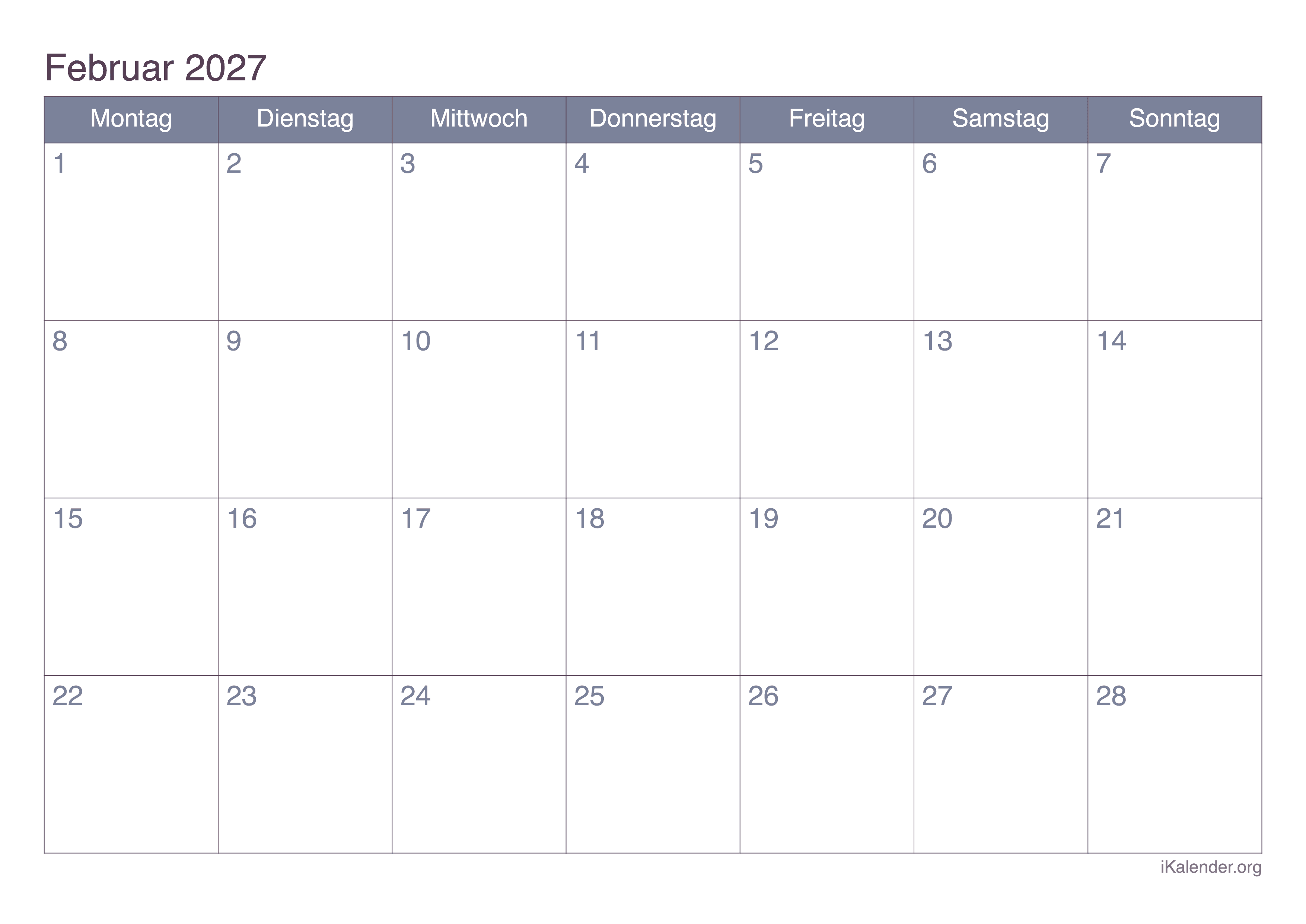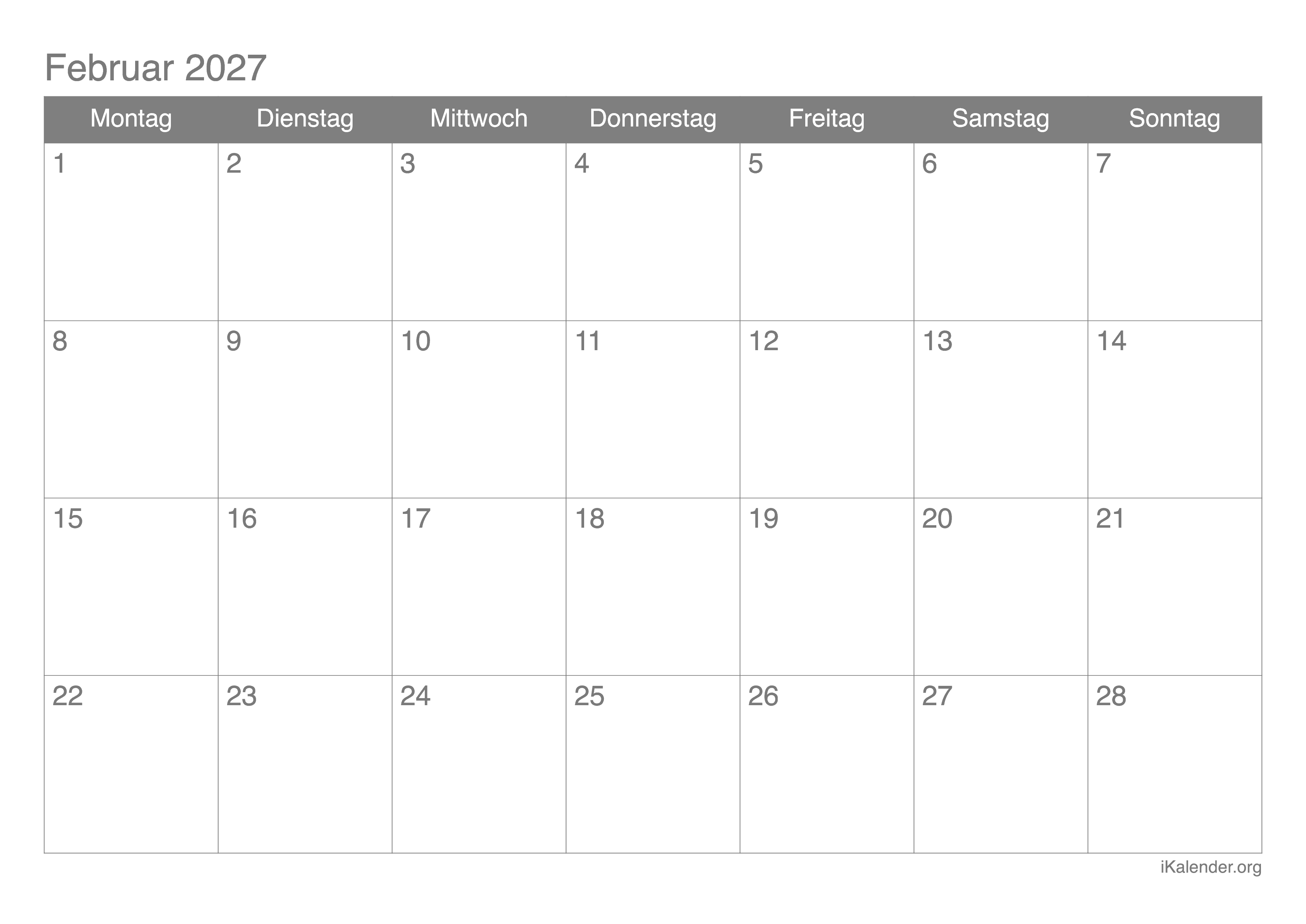 Sie können den Blanko-Kalender für Februar 2027 kostenlos im Bild-, PDF- und Excel-Format herunterladen und ausdrucken. Dort finden Sie auch andere Themen-Kalender 2027 für den Monat Februar.