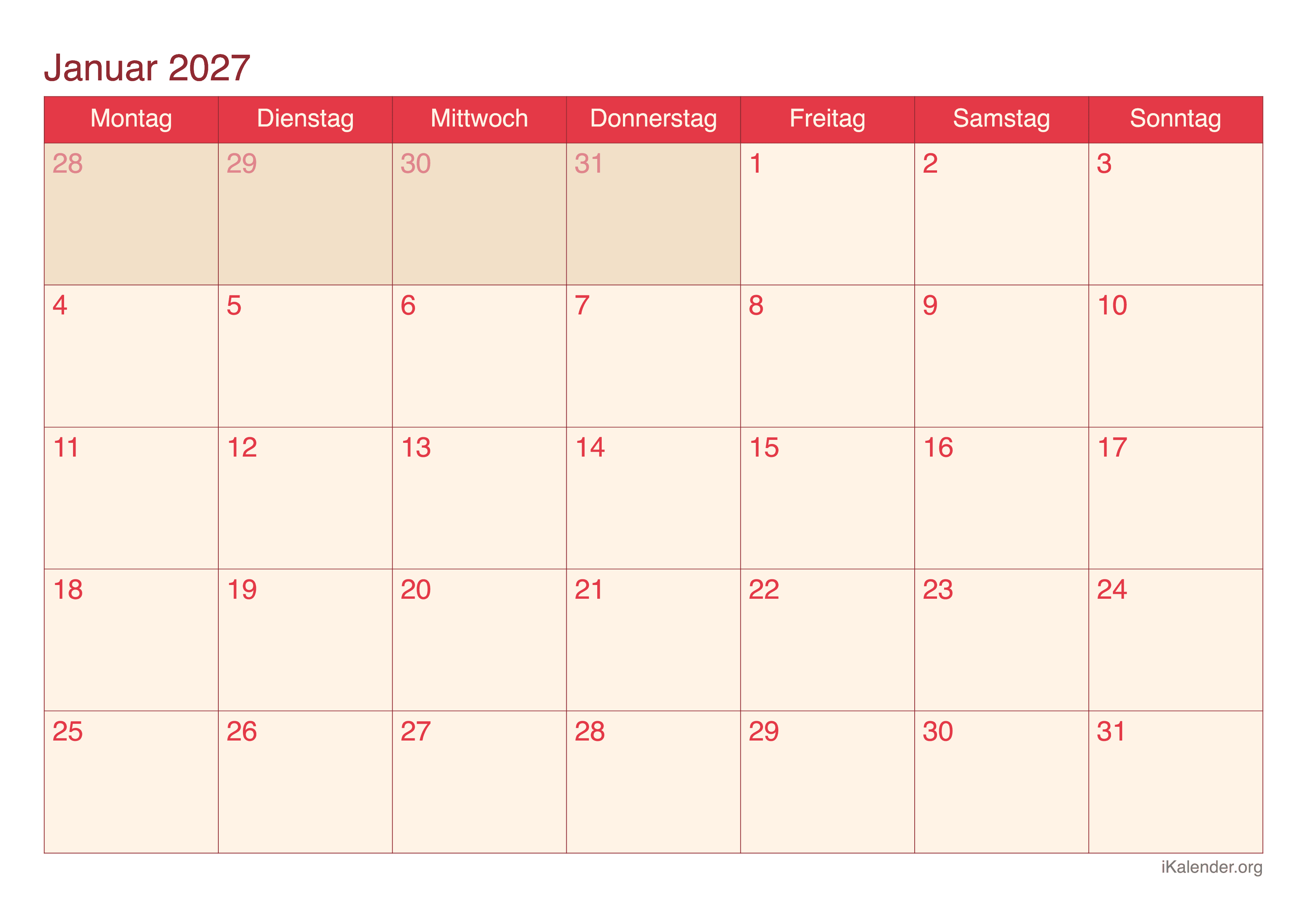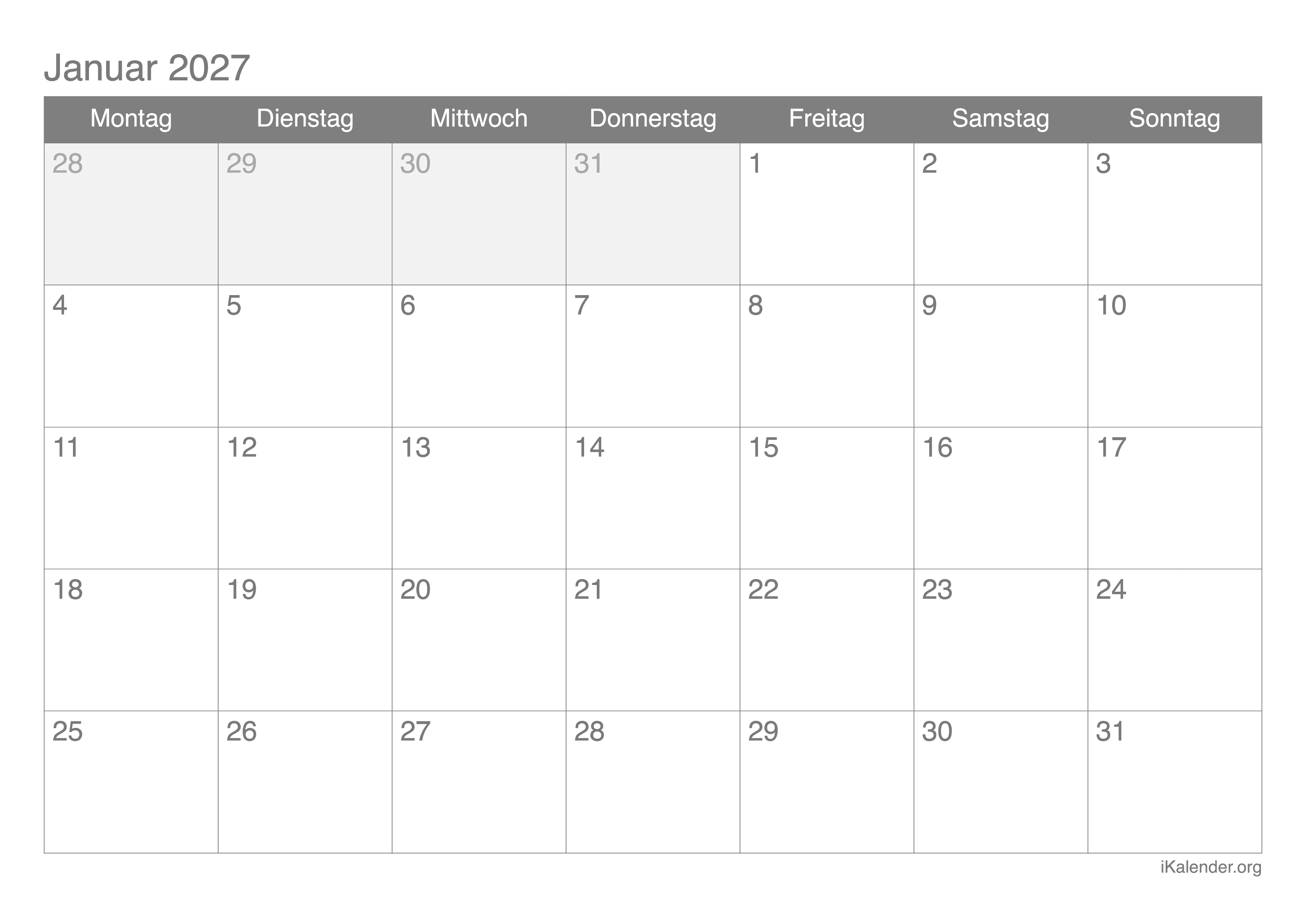 Monatskalender Januar 2027 zum Ausdrucken