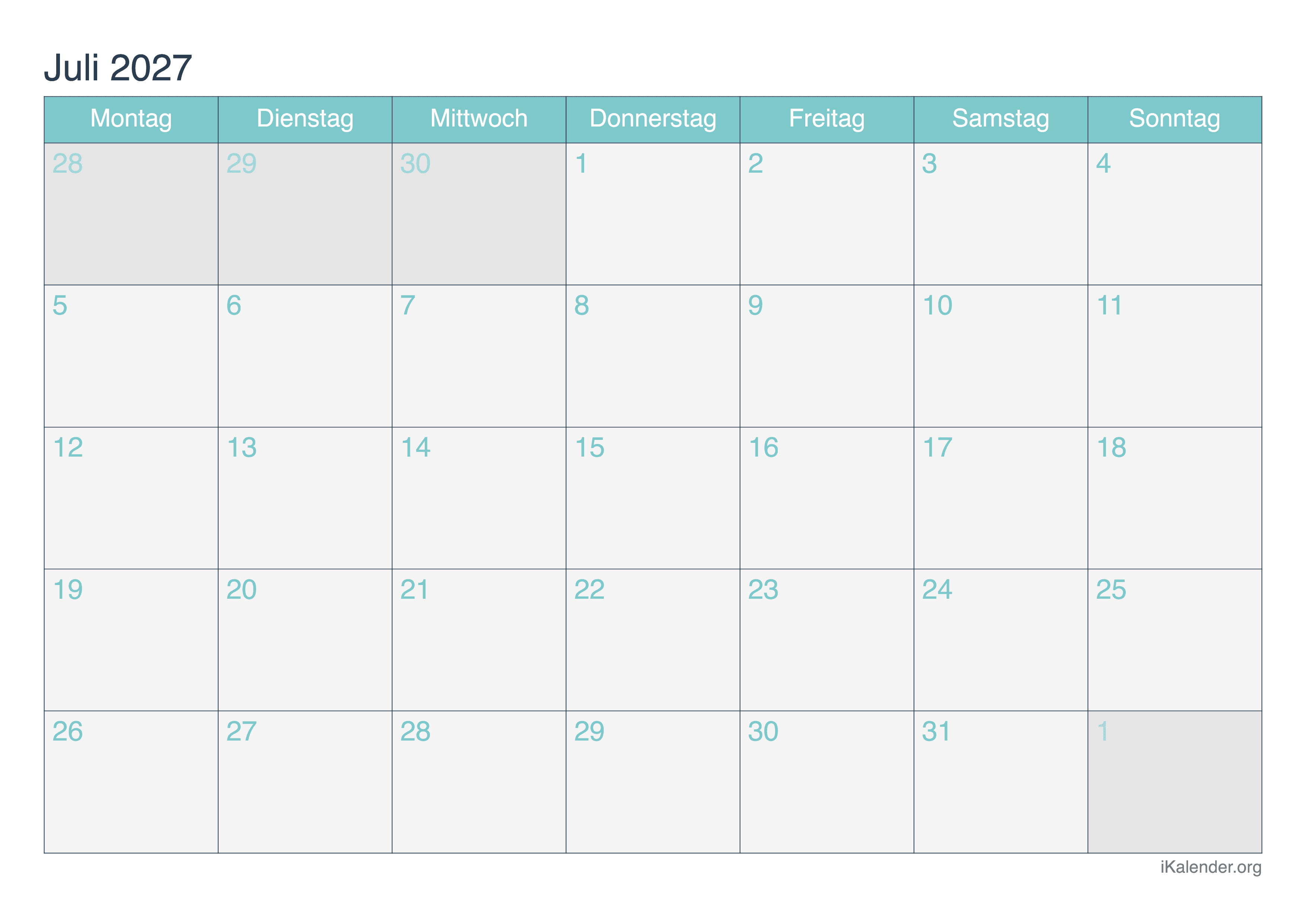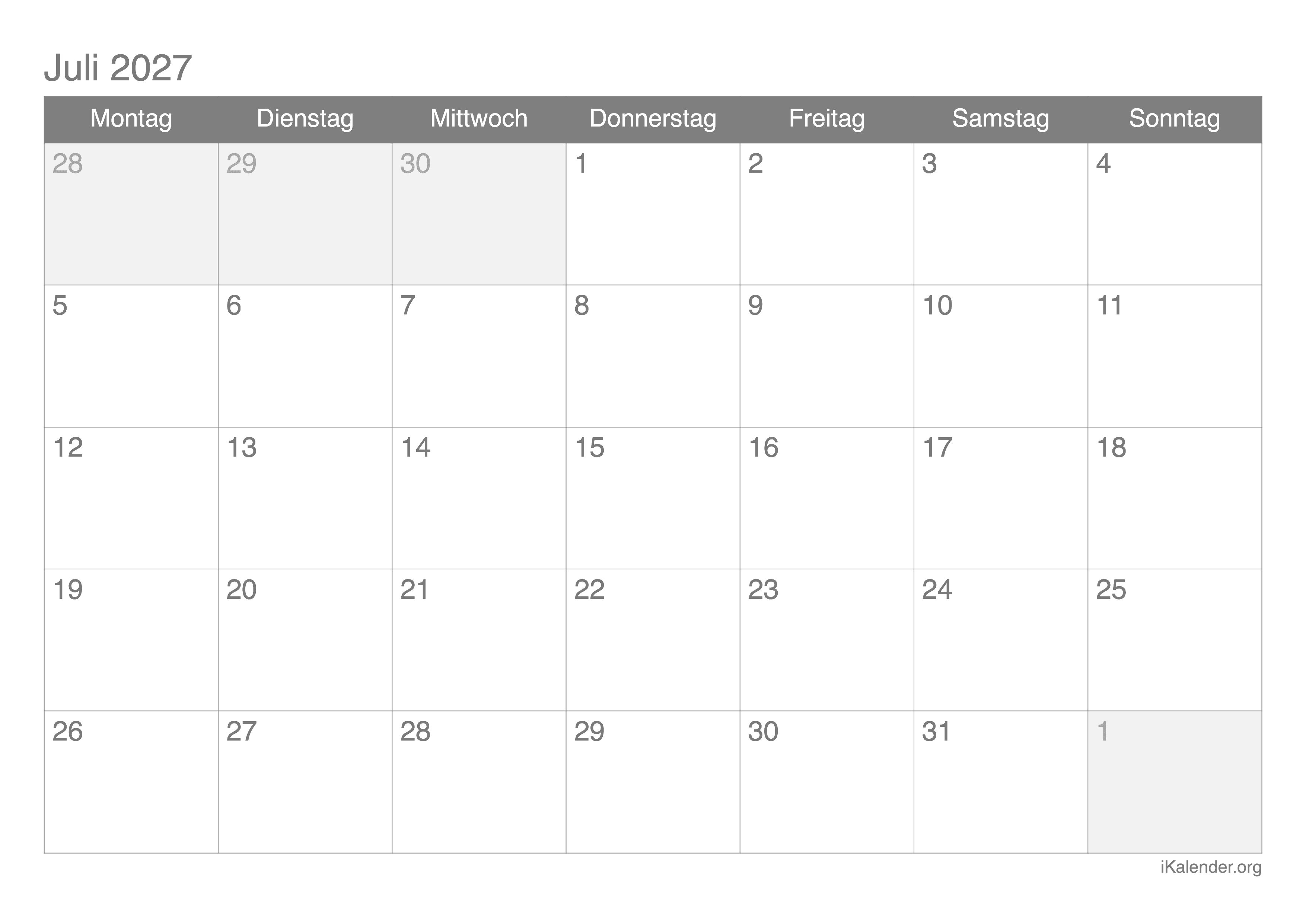 Sie können den Blanko-Kalender für Juli 2027 kostenlos im Bild-, PDF- und Excel-Format herunterladen und ausdrucken. Dort finden Sie auch andere Themen-Kalender 2027 für den Monat Juli.