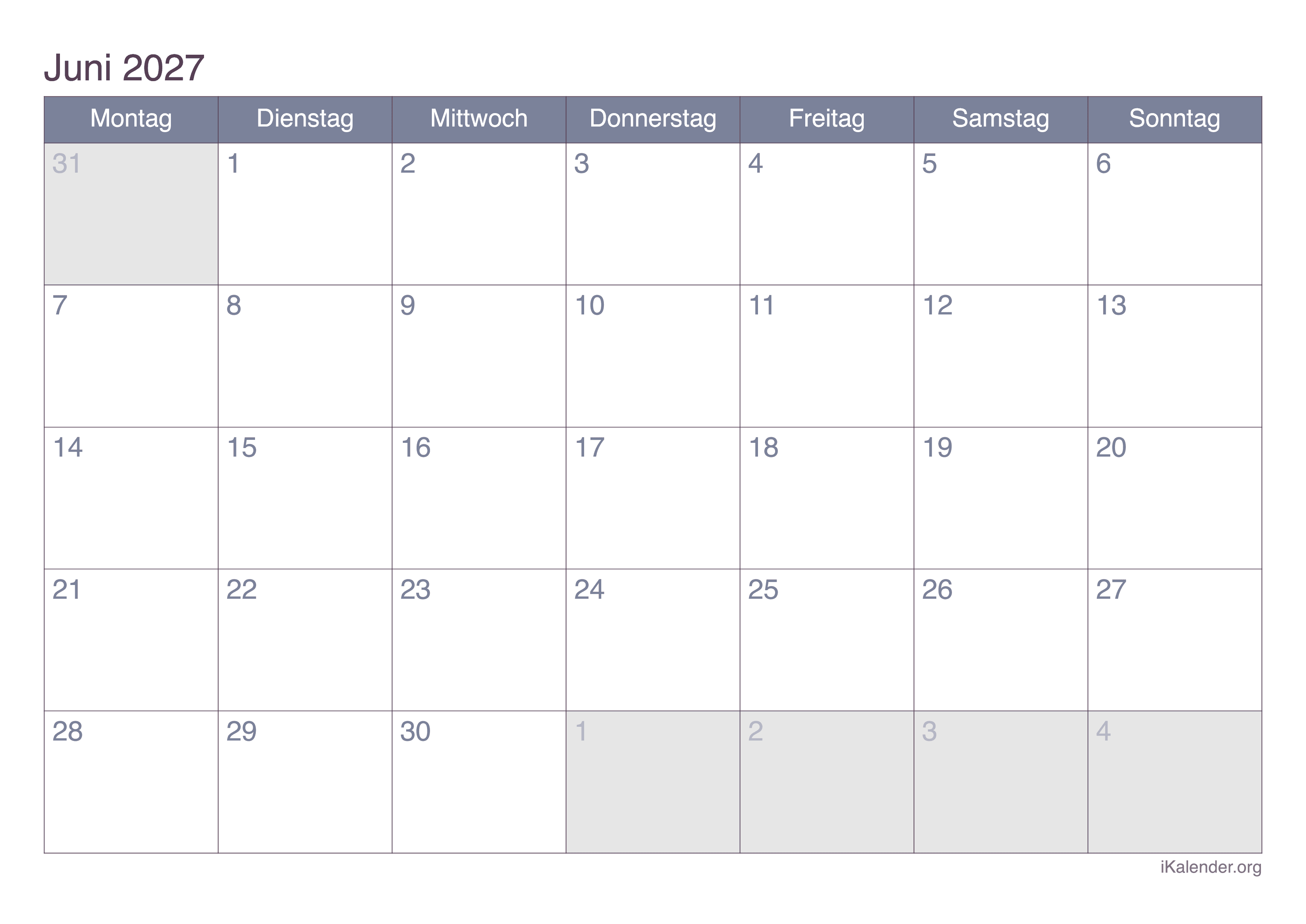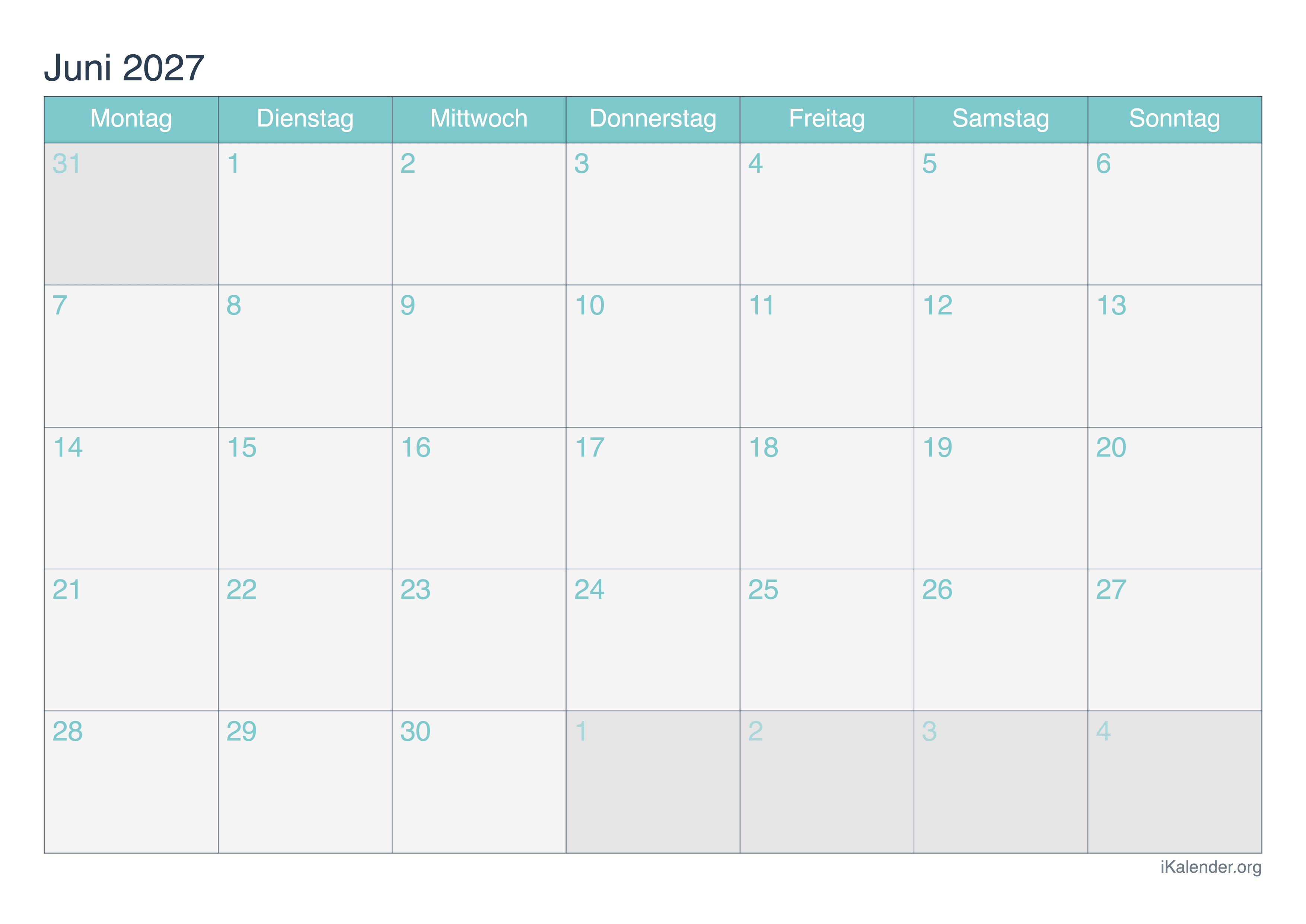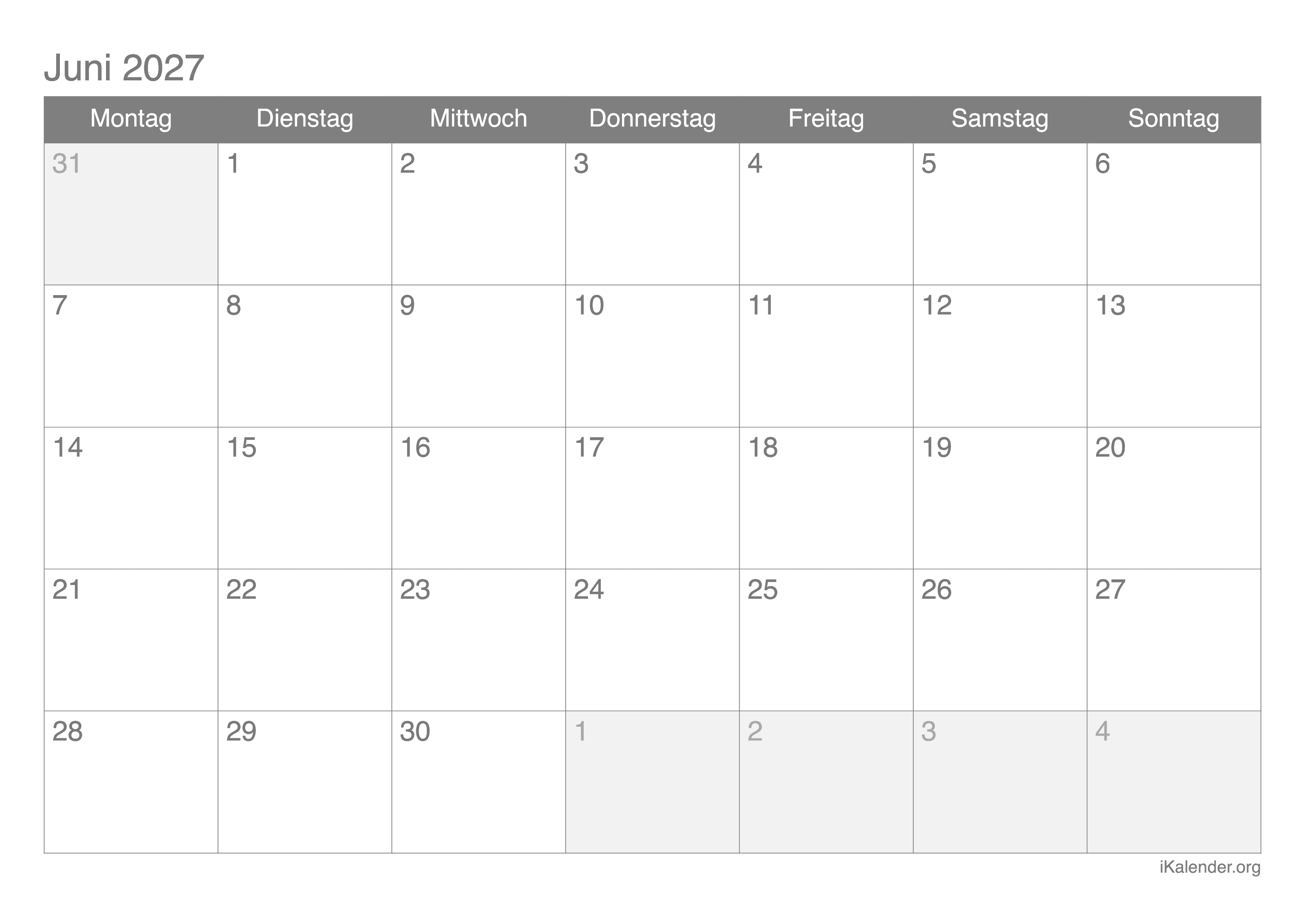 Sie können den Blanko-Kalender für Juni 2027 kostenlos im Bild-, PDF- und Excel-Format herunterladen und ausdrucken. Dort finden Sie auch andere Themen-Kalender 2027 für den Monat Juni.