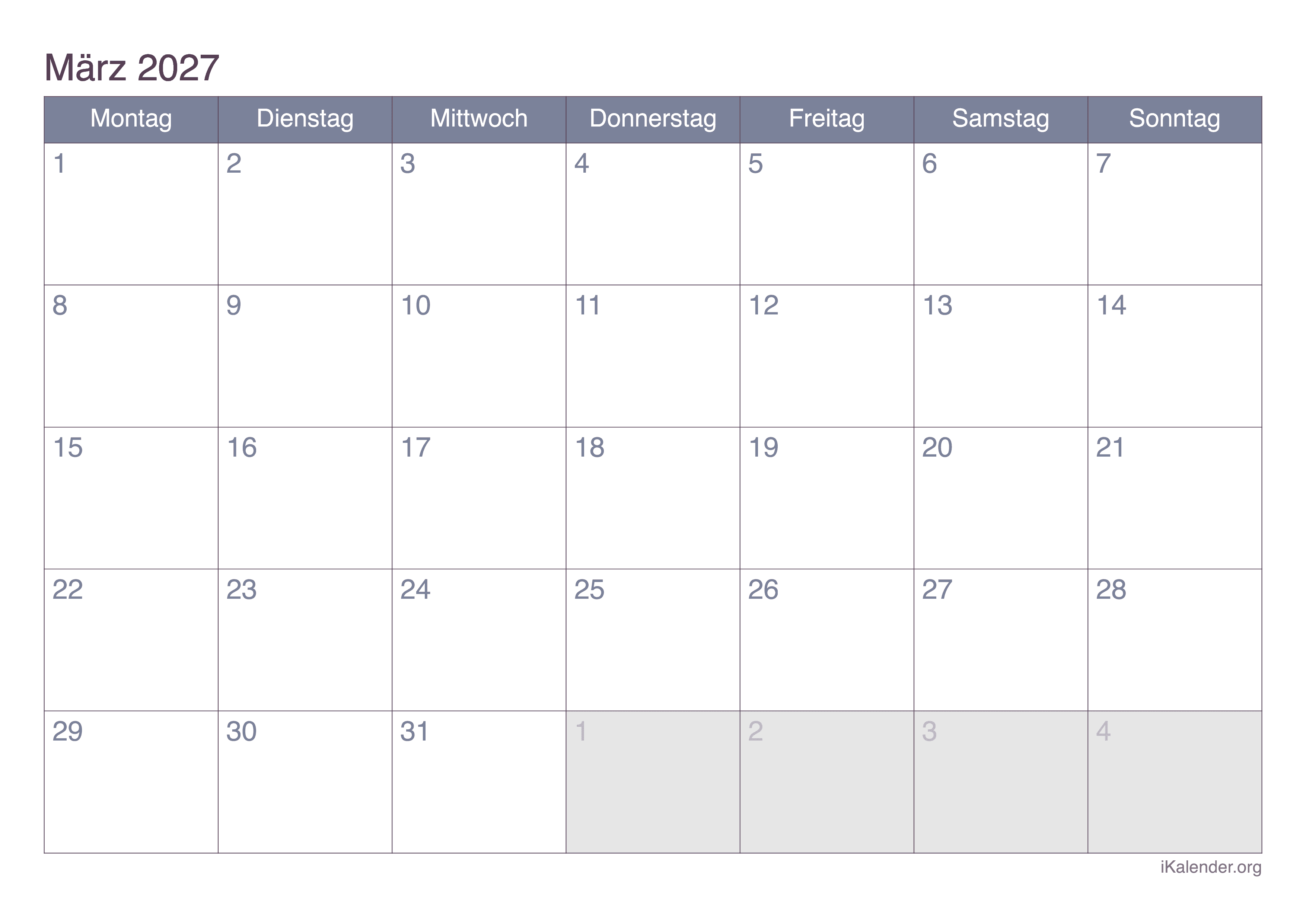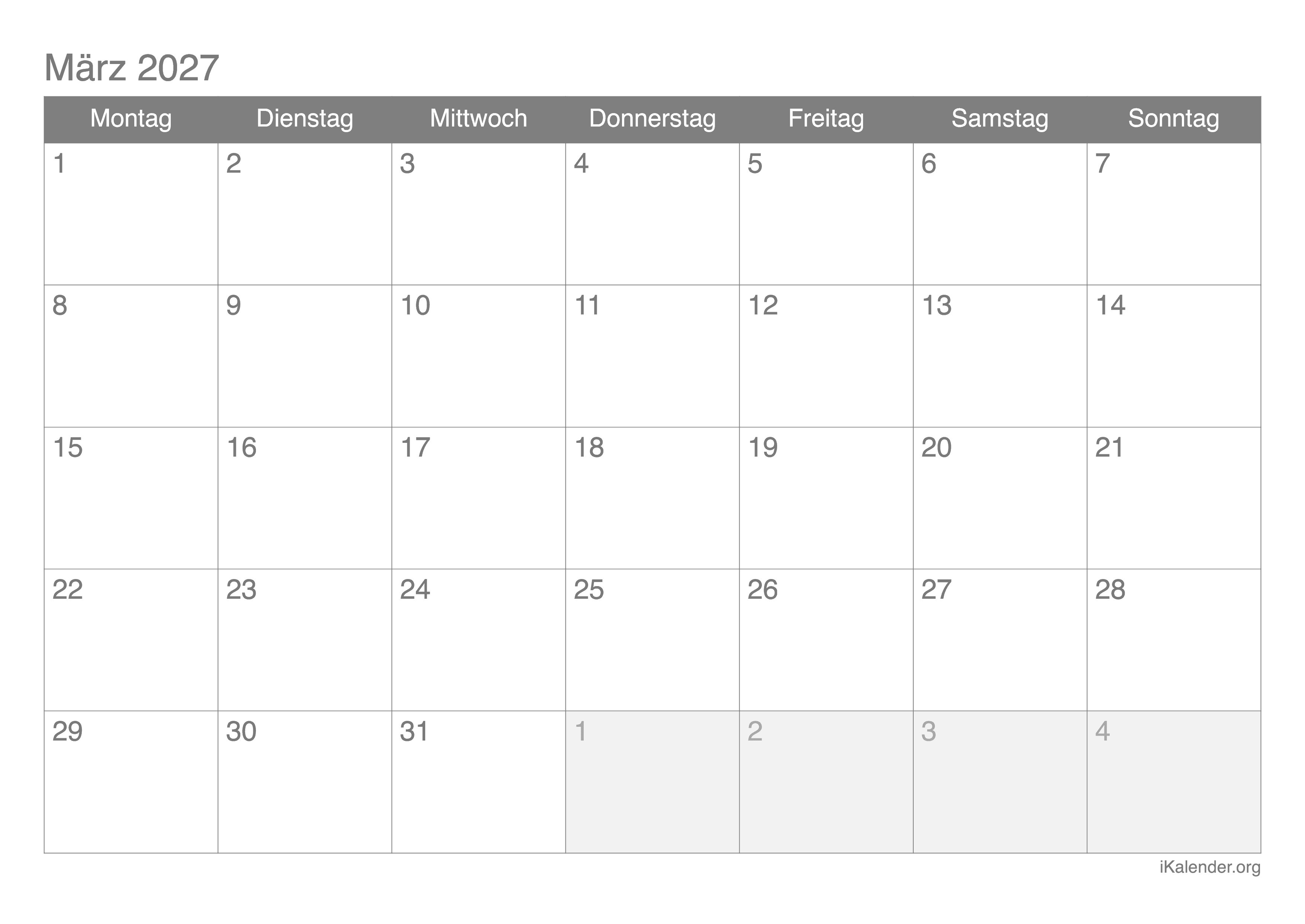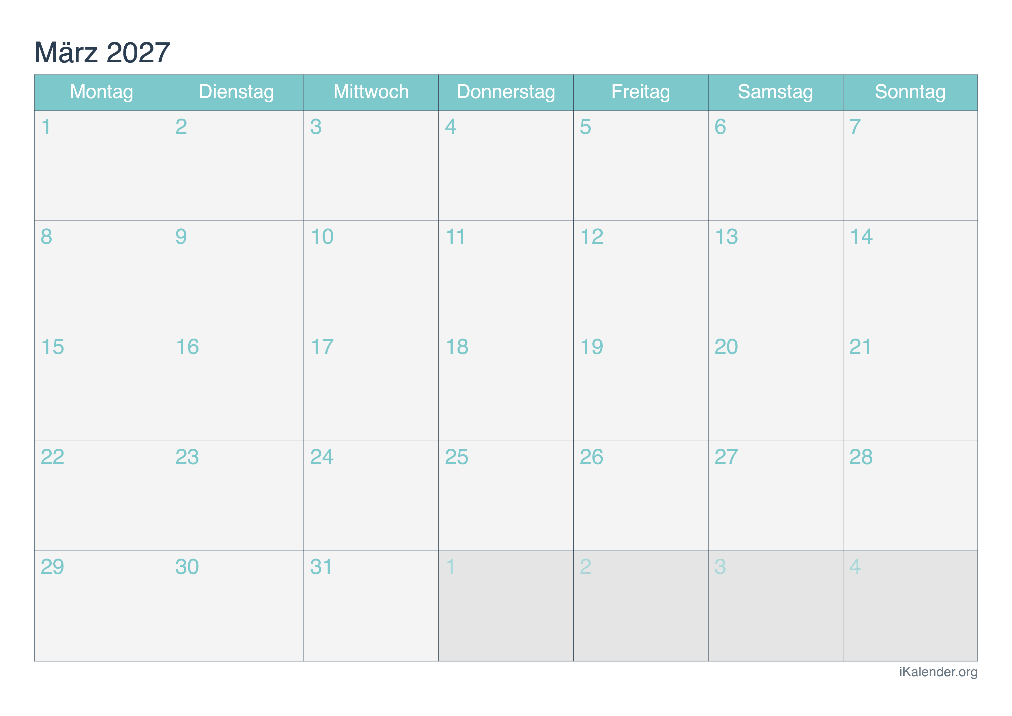 Sie können den Blanko-Kalender für März 2027 kostenlos im Bild-, PDF- und Excel-Format herunterladen und ausdrucken. Dort finden Sie auch andere Themen-Kalender 2027 für den Monat März.