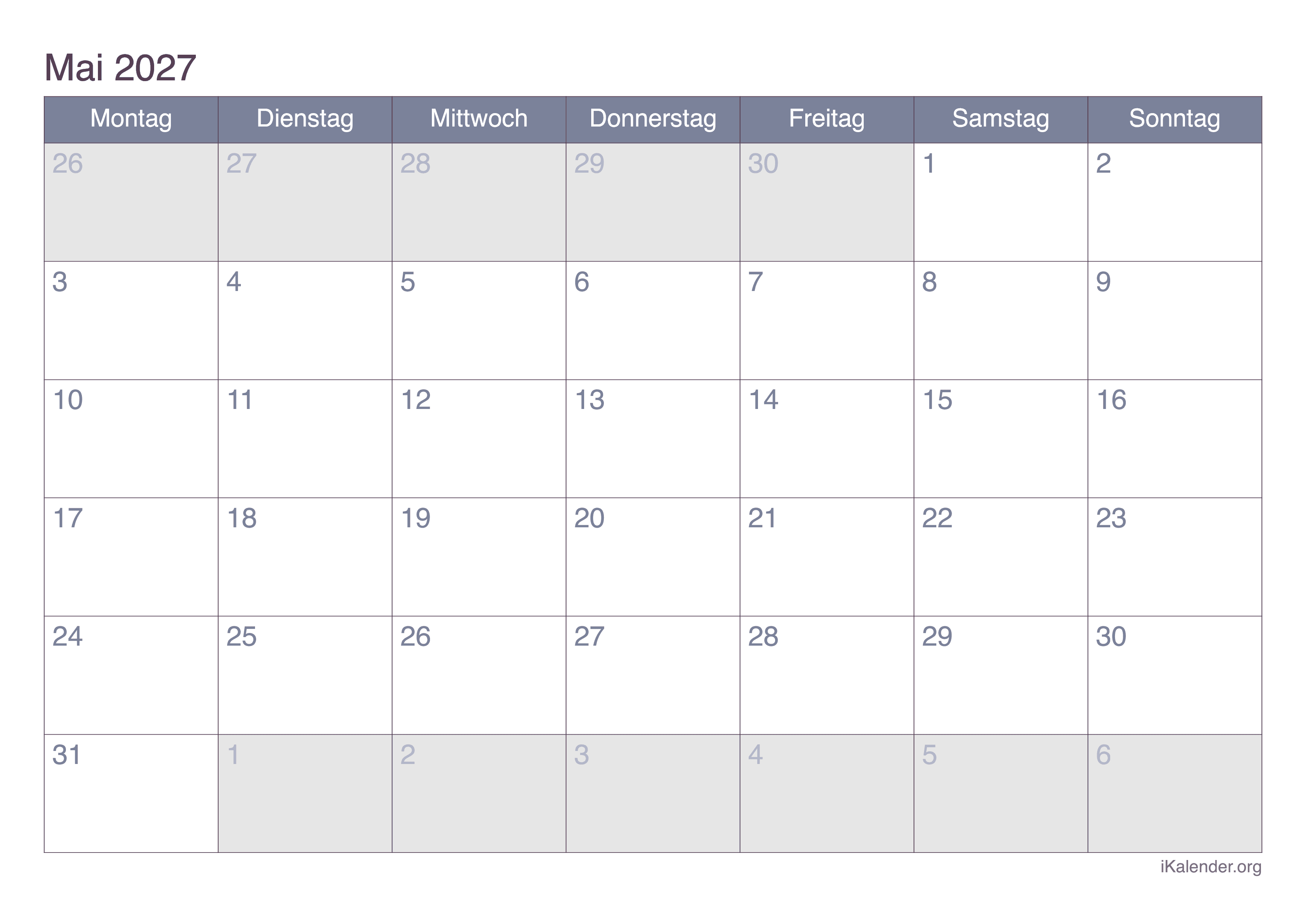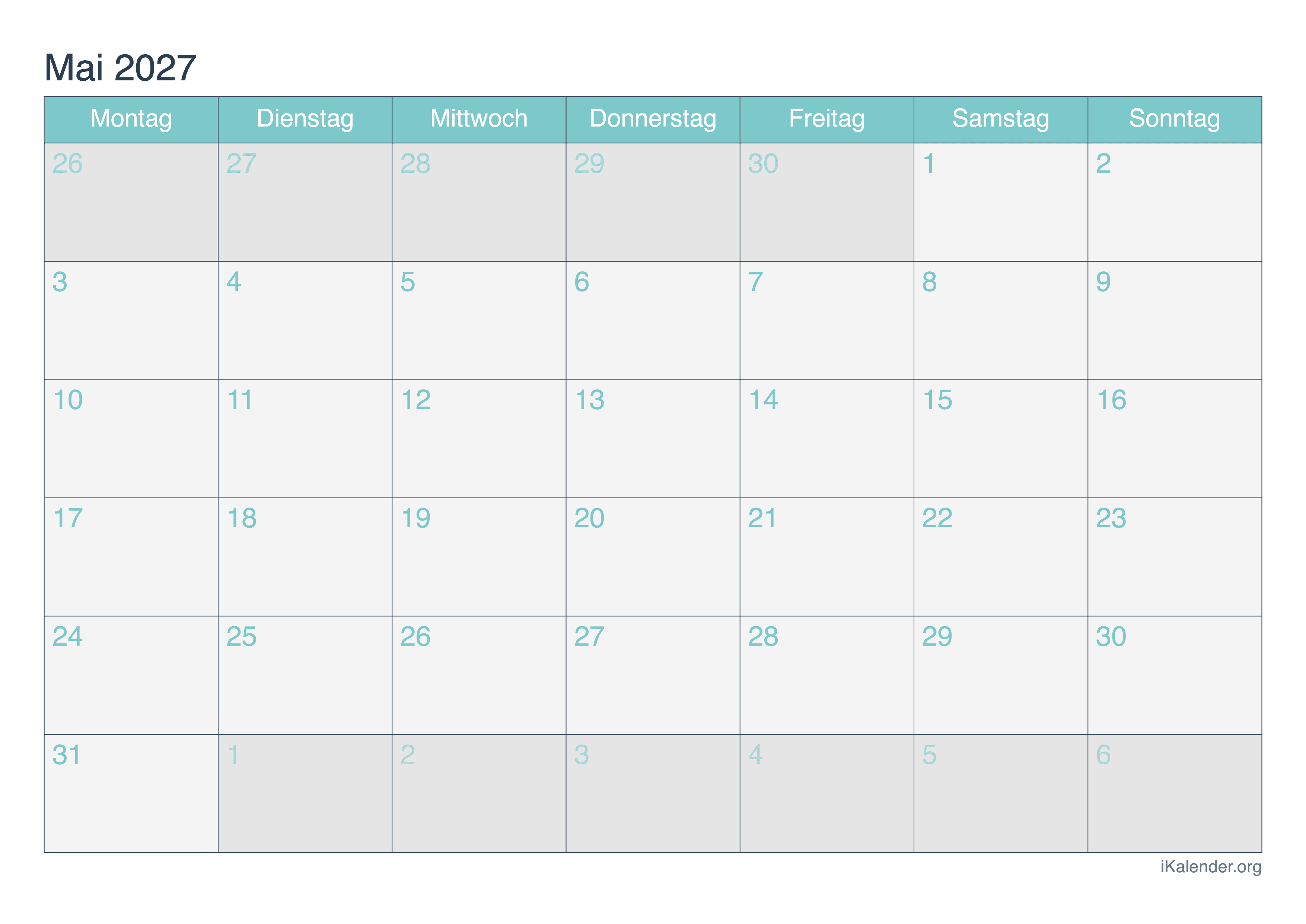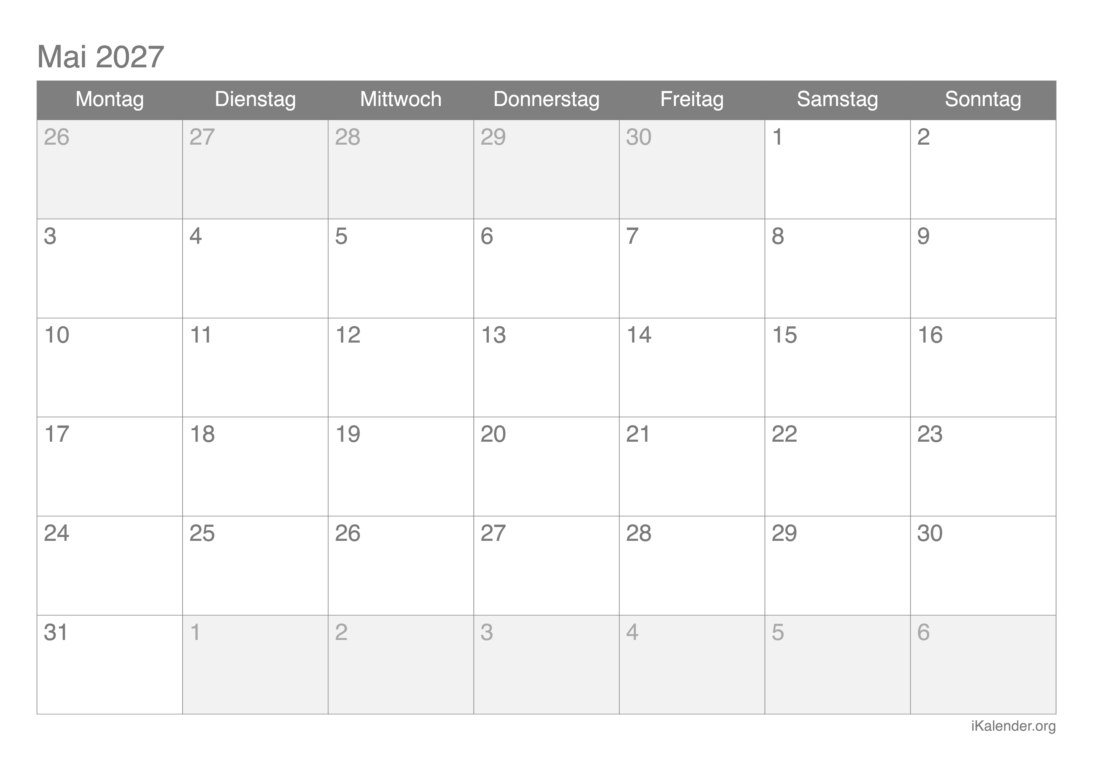 Sie können den Blanko-Kalender für Mai 2027 kostenlos im Bild-, PDF- und Excel-Format herunterladen und ausdrucken. Dort finden Sie auch andere Themen-Kalender 2027 für den Monat Mai.