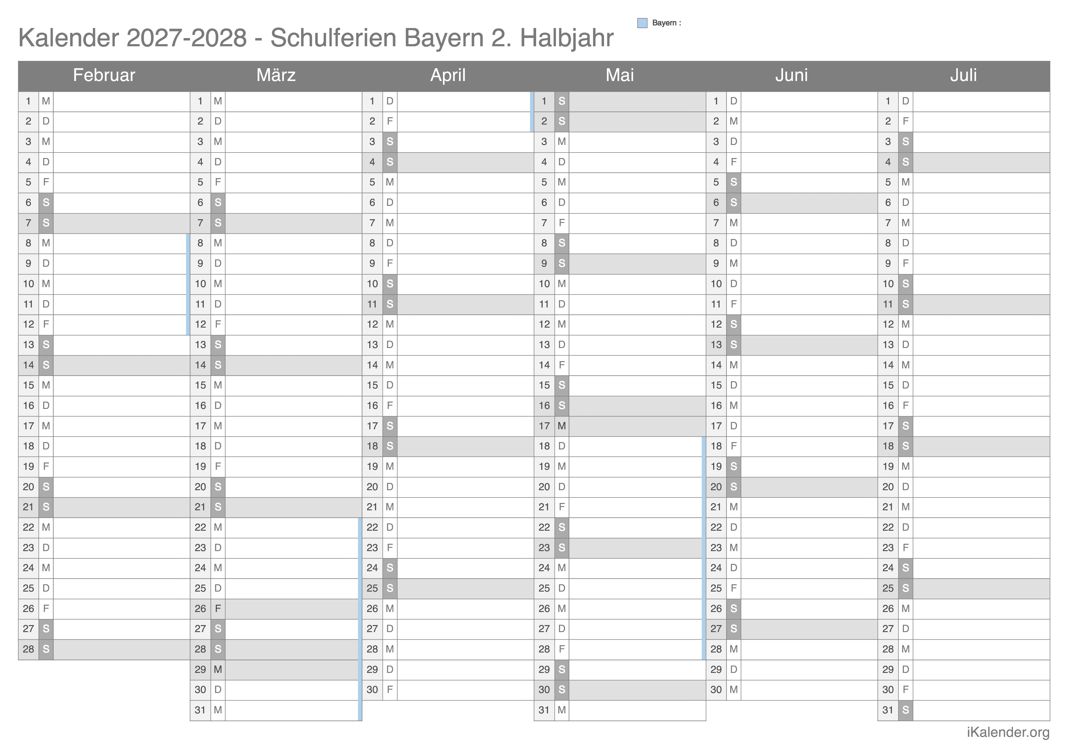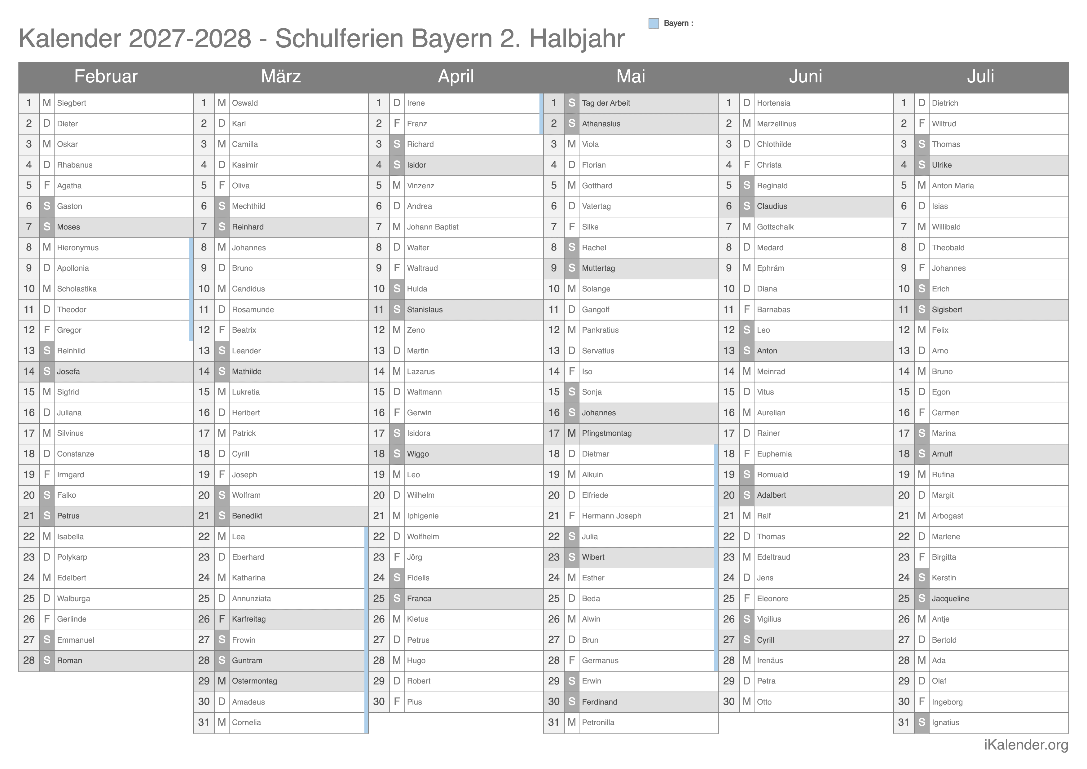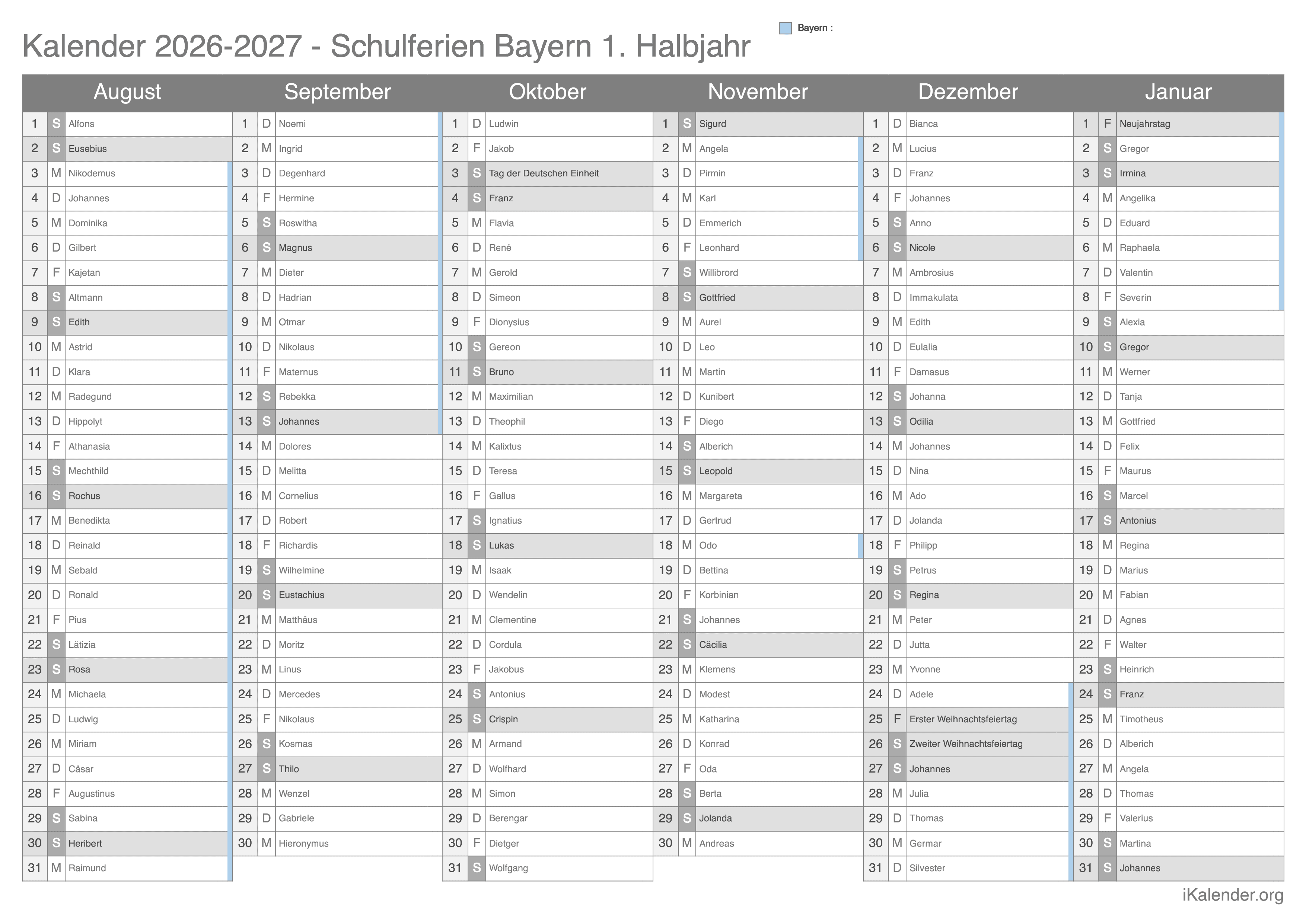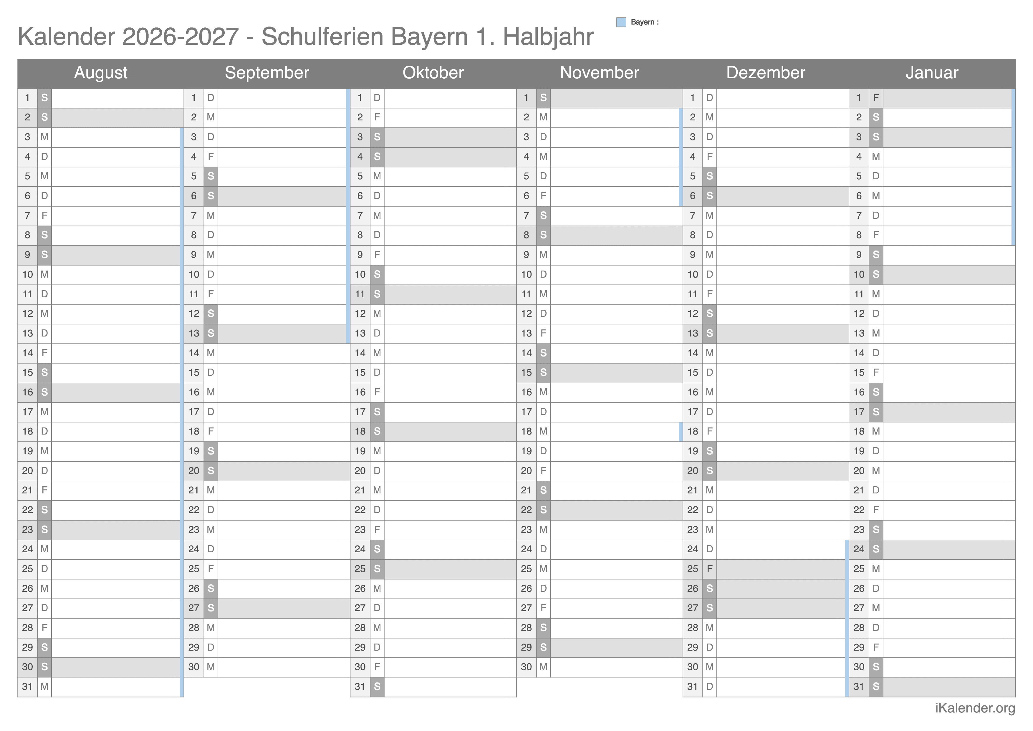 Schulferienkalender Bayern 2026 - 2027 zum Ausdrucken