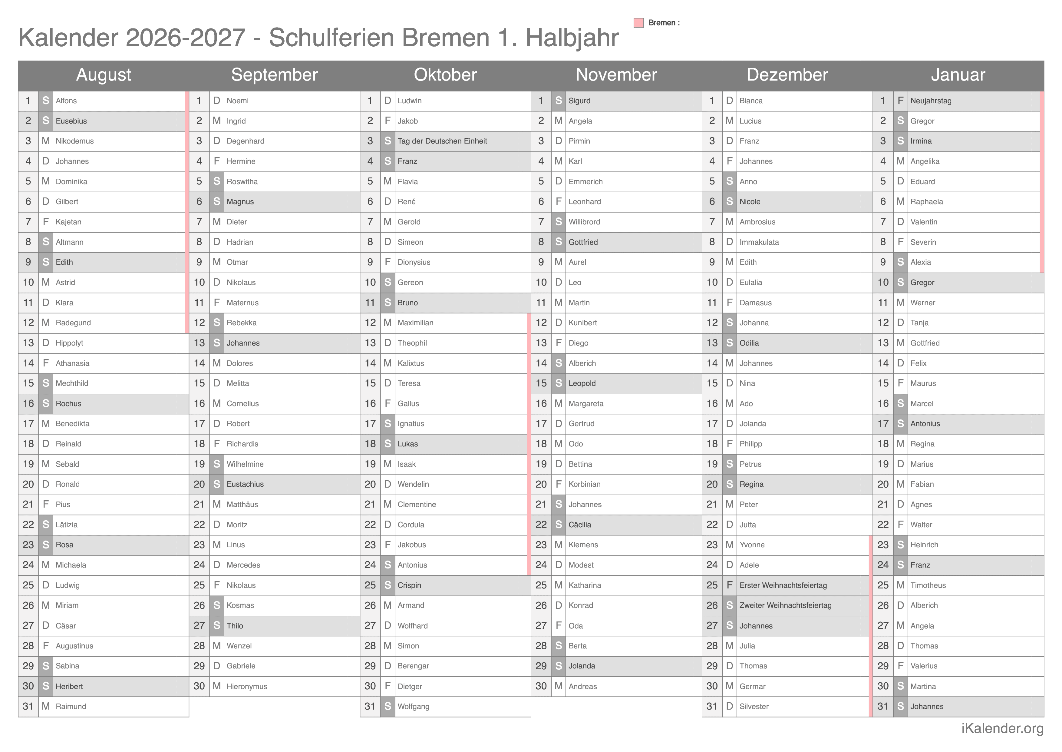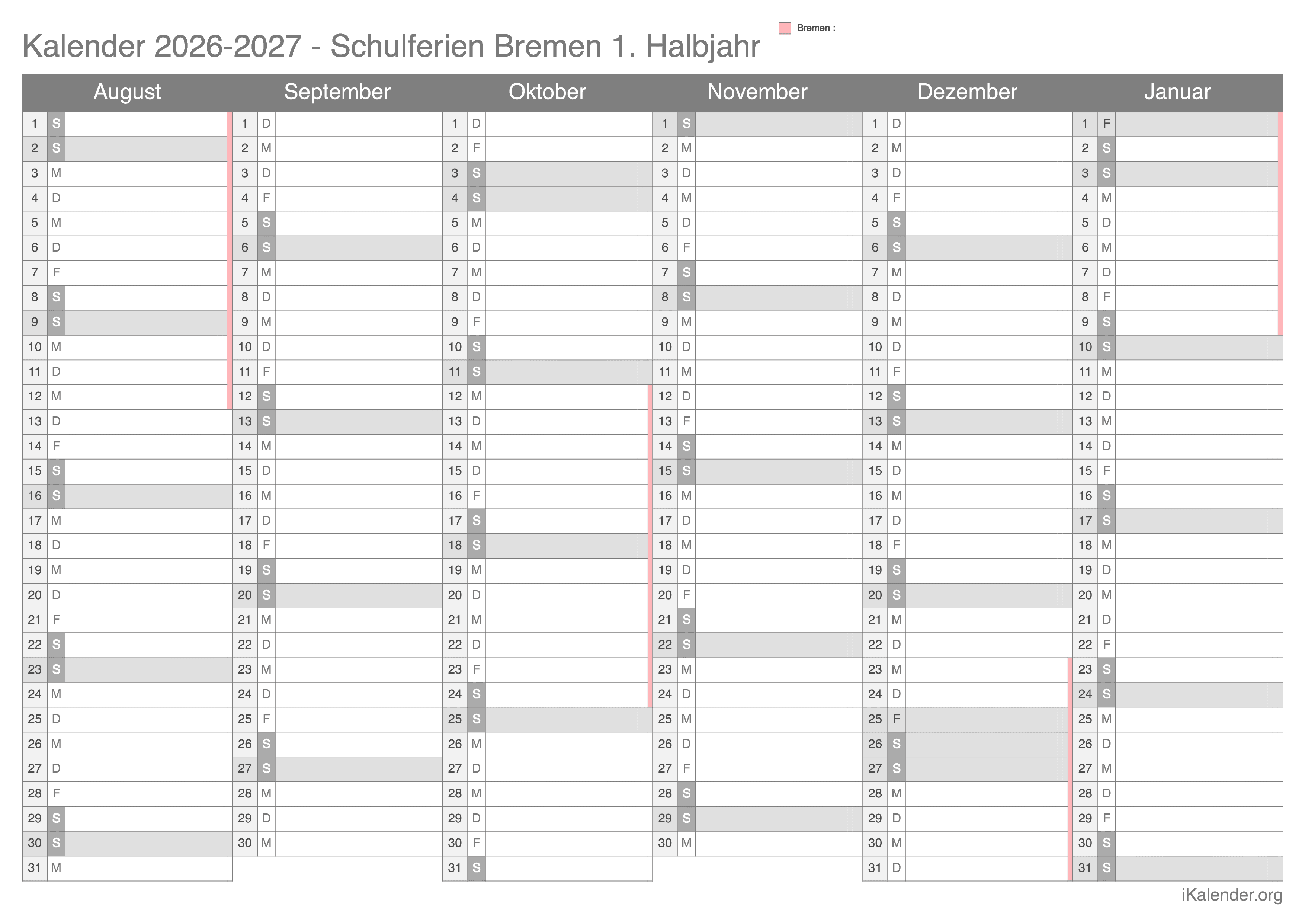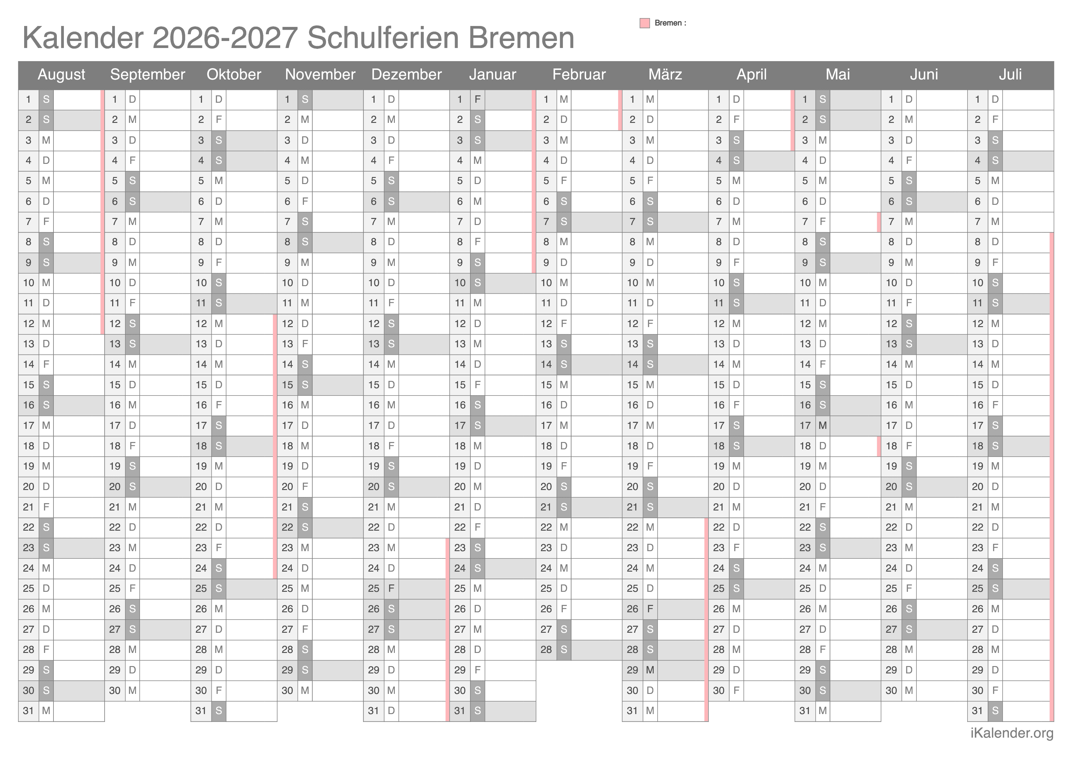 Schulferienkalender Bremen 2026 - 2027 zum Ausdrucken
