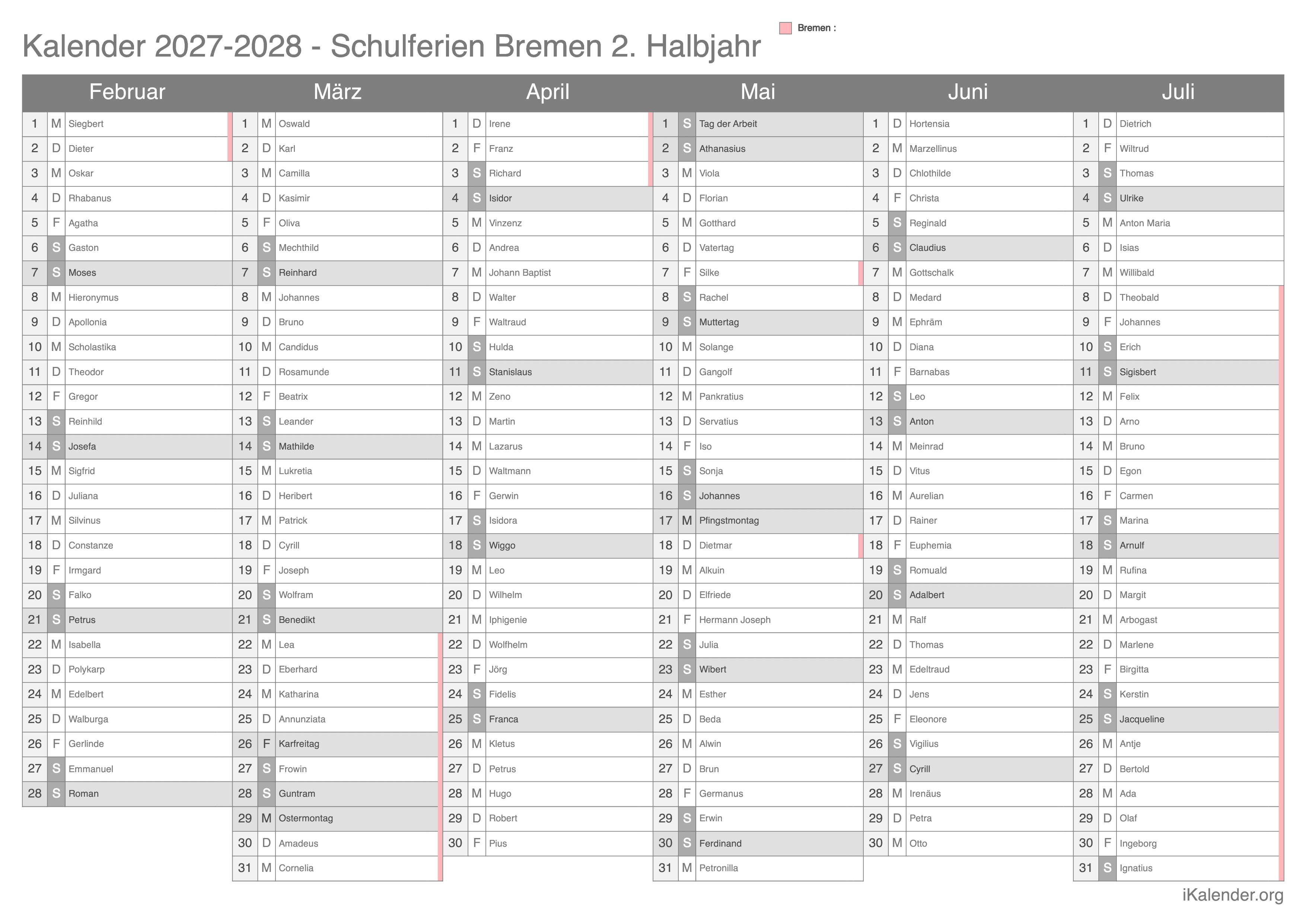 Folgender Kalender kann kostenlos heruntergeladen und ausgedruckt werden, er ist im Bildformat und als PDF verfügbar. Für jedes Bundesland gibt es einen eigenen kostenlosen Kalender.