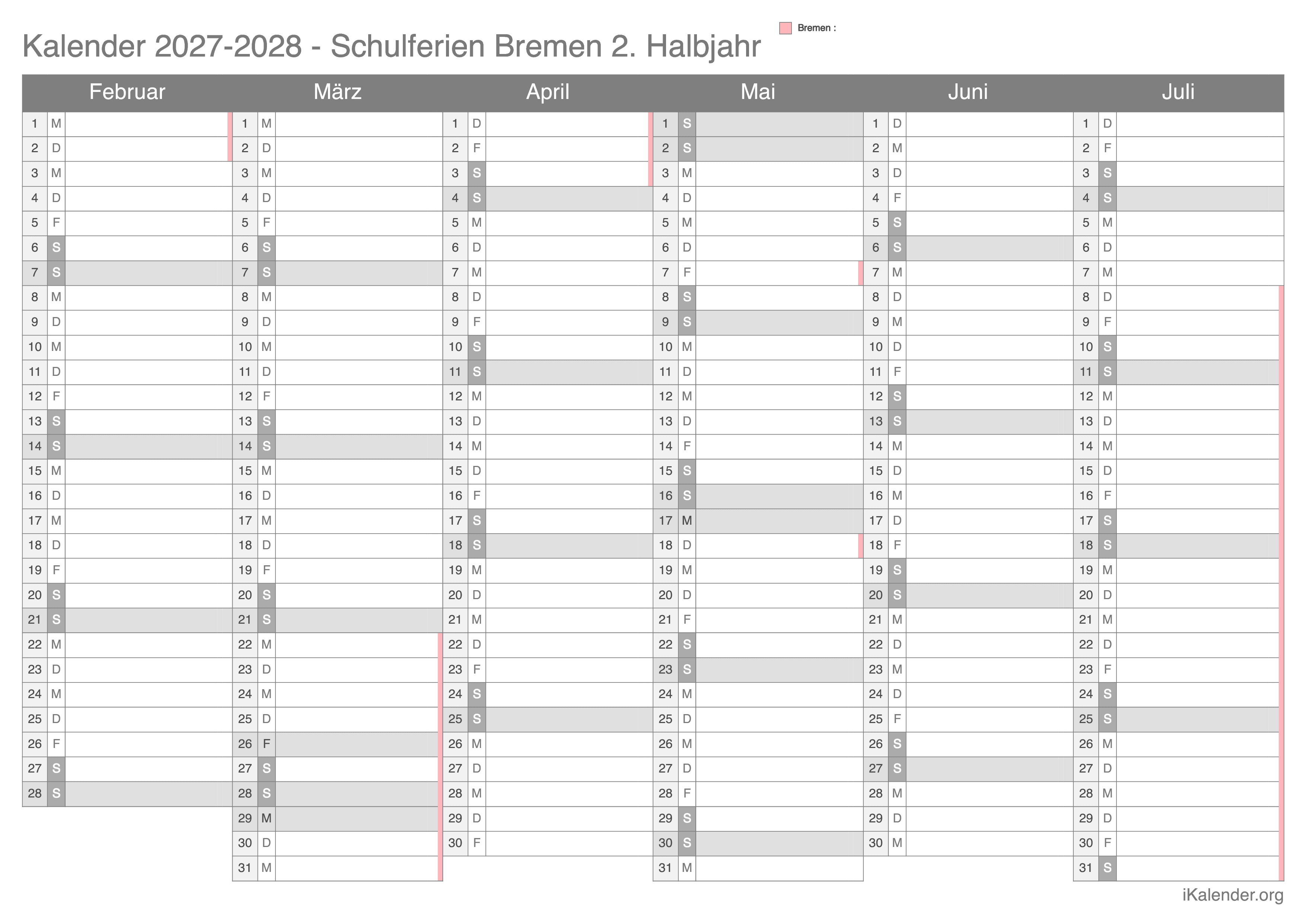 Der Kalender kann auch im Halbjahresformat heruntergeladen werden, wobei die Schulferien für jeden Monat angegeben sind.