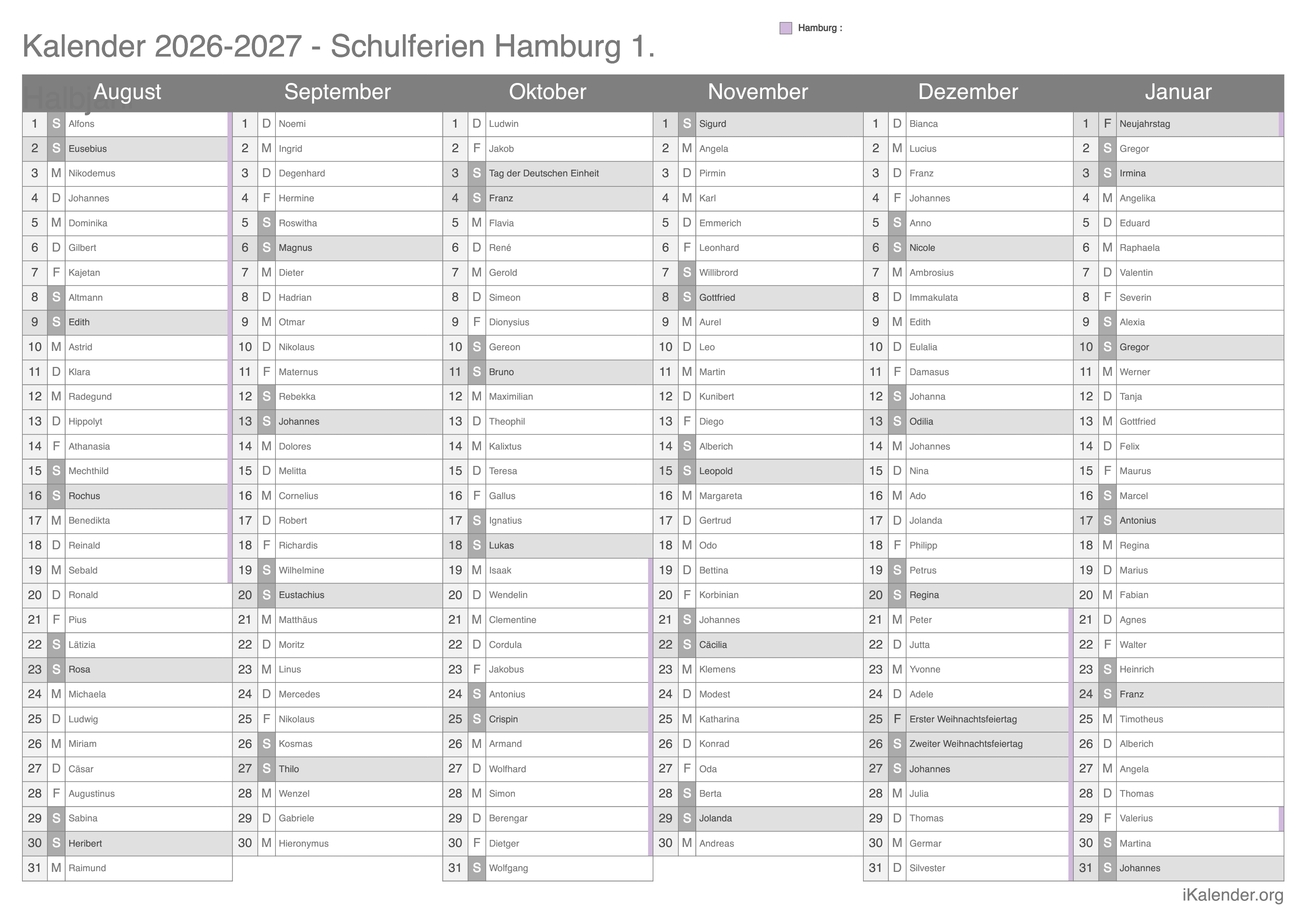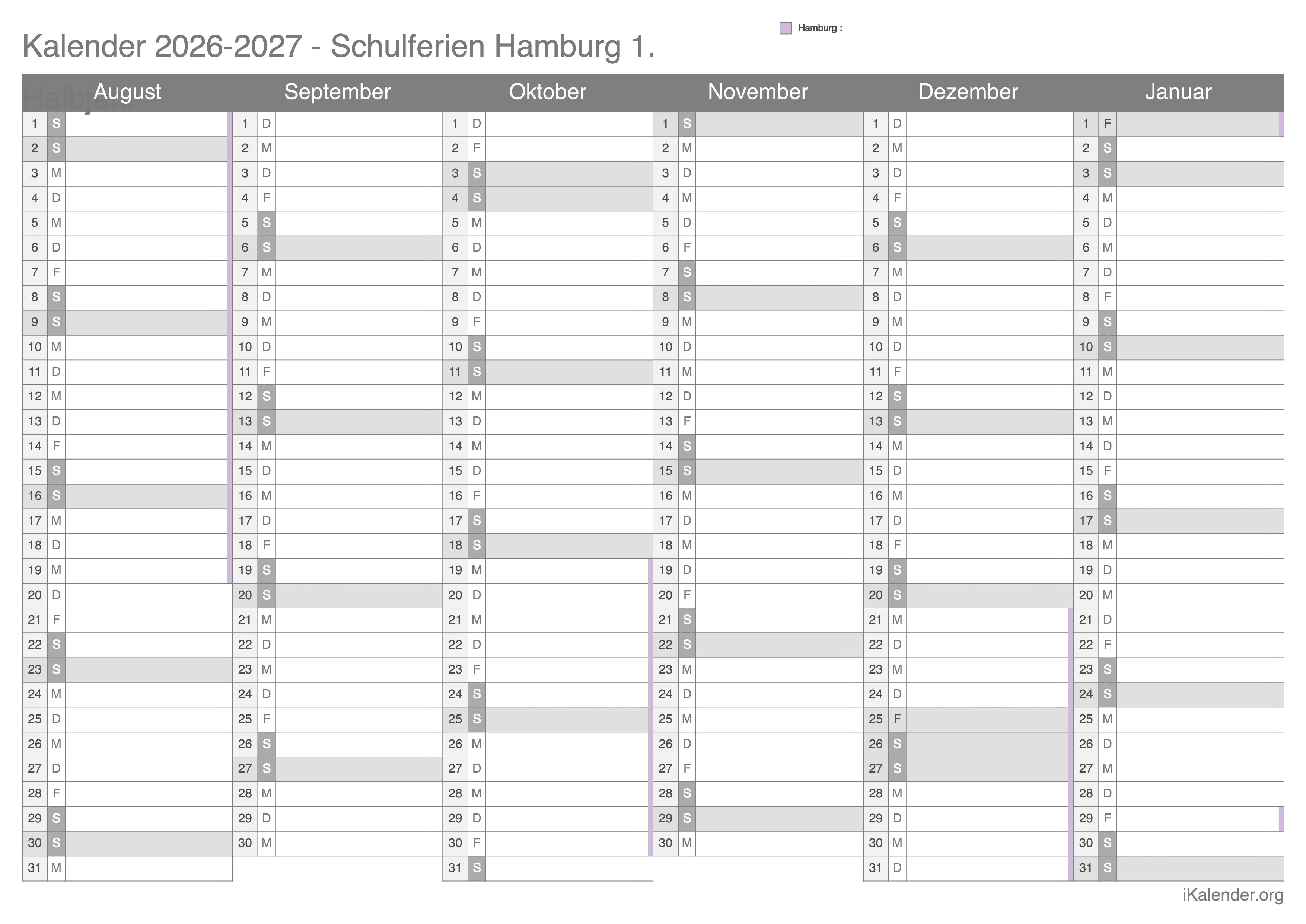 Schulferienkalender Hamburg 2026 - 2027 zum Ausdrucken