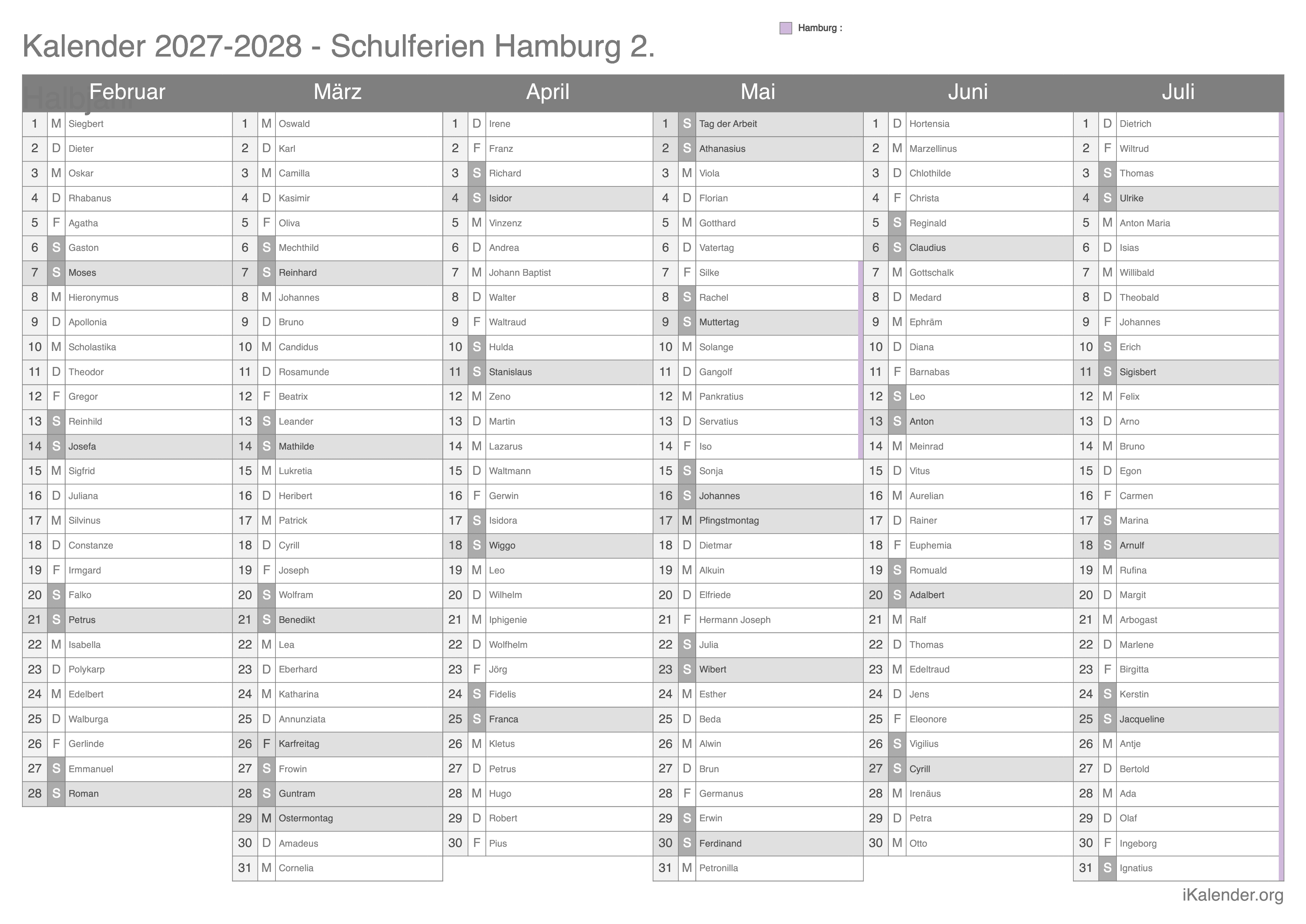 Der Kalender kann auch im Halbjahresformat heruntergeladen werden, wobei die Schulferien für jeden Monat angegeben sind.