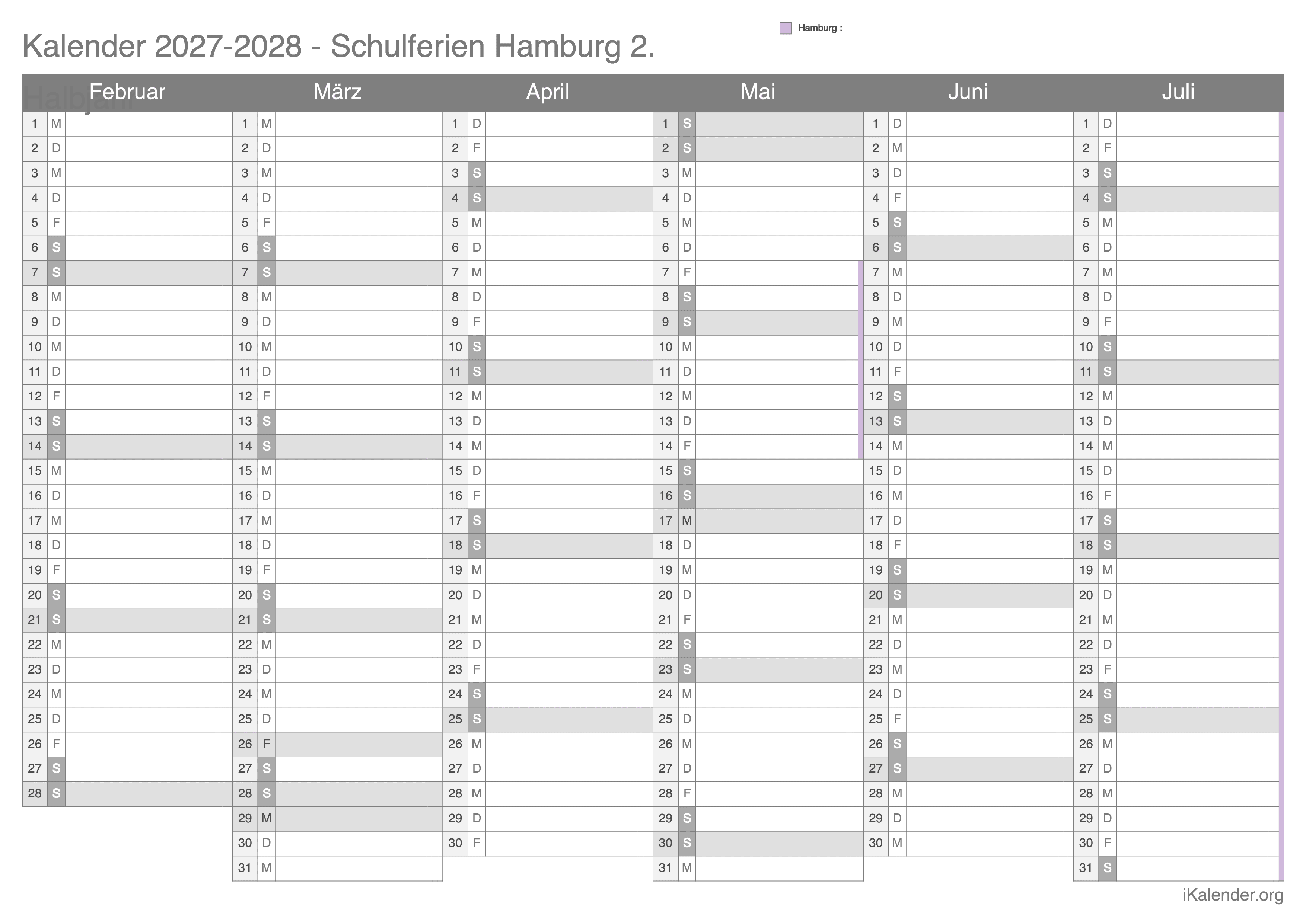 | Sommerferien 2027 | Hamburg | Donnerstag, 1. Juli 2027 | Mittwoch, 11. August 2027 |