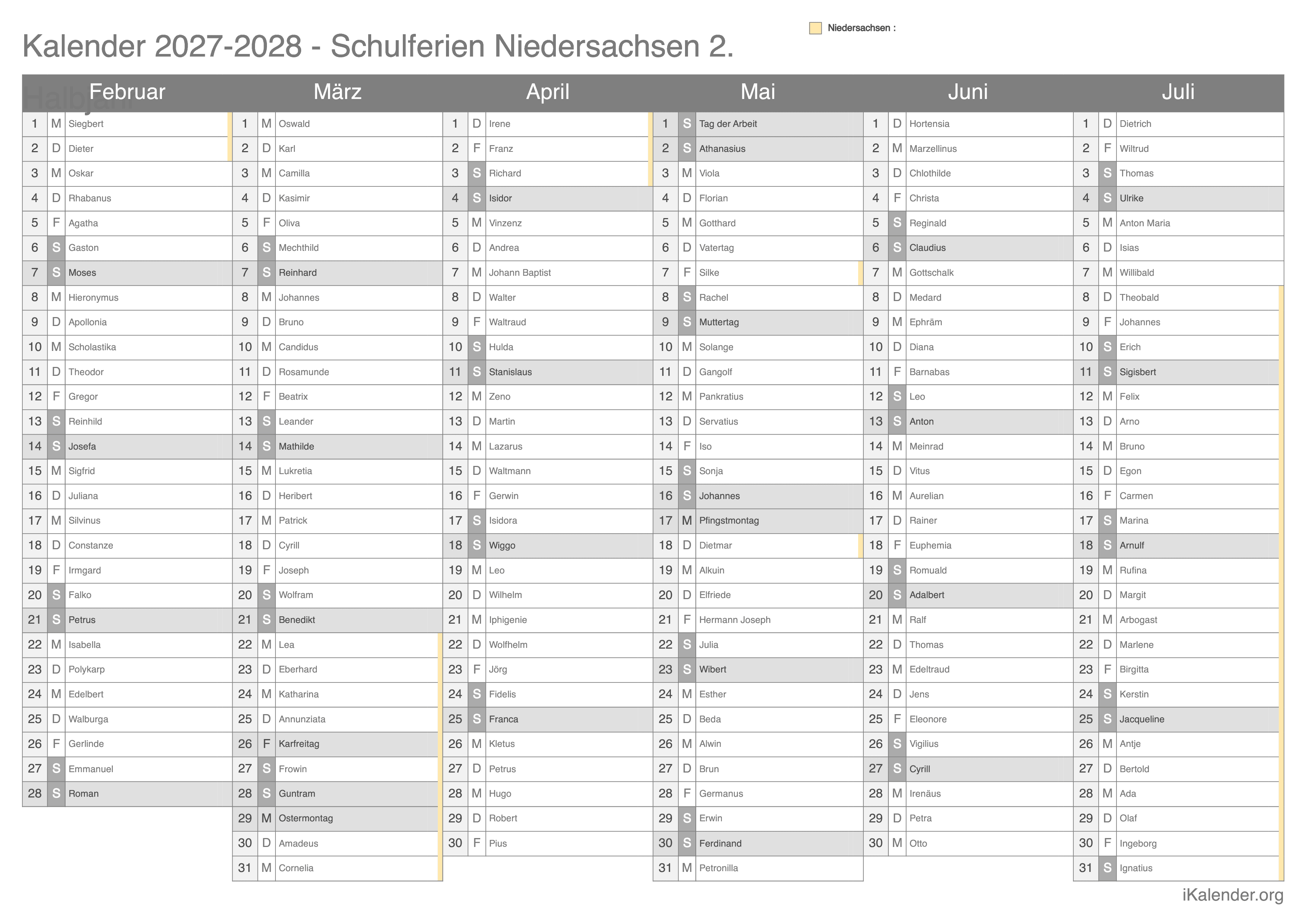 Folgender Kalender kann kostenlos heruntergeladen und ausgedruckt werden, er ist im Bildformat und als PDF verfügbar. Für jedes Bundesland gibt es einen eigenen kostenlosen Kalender.