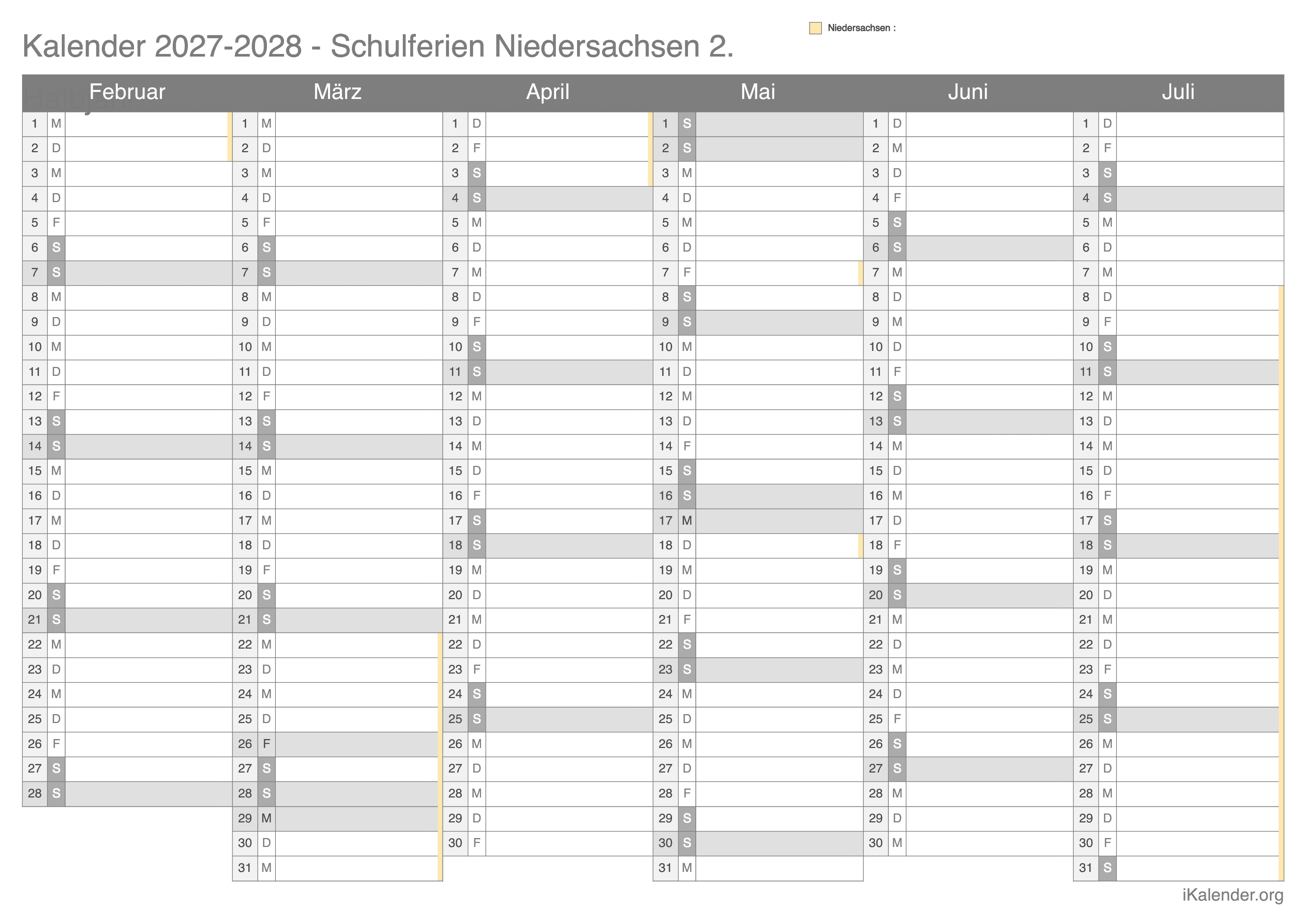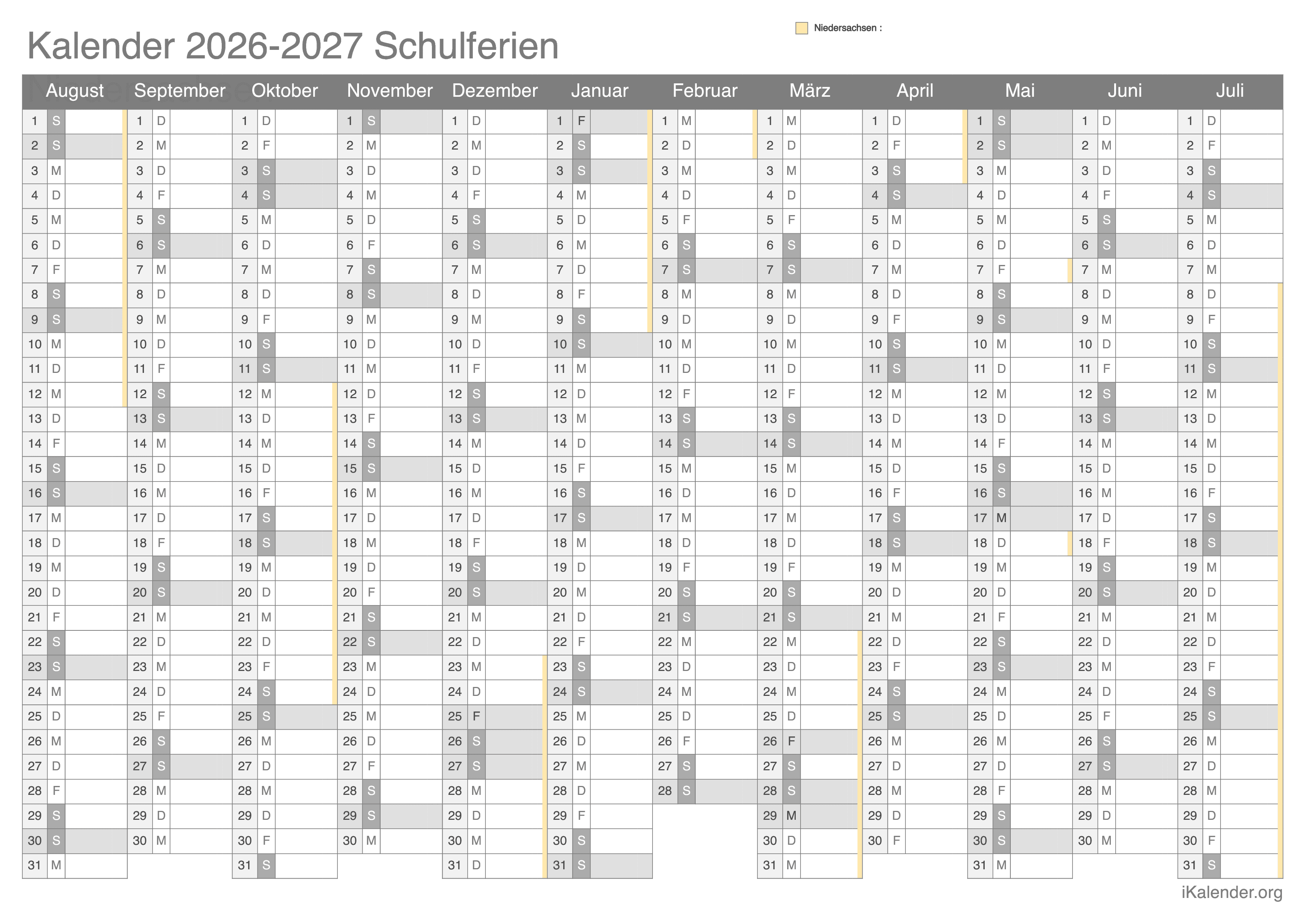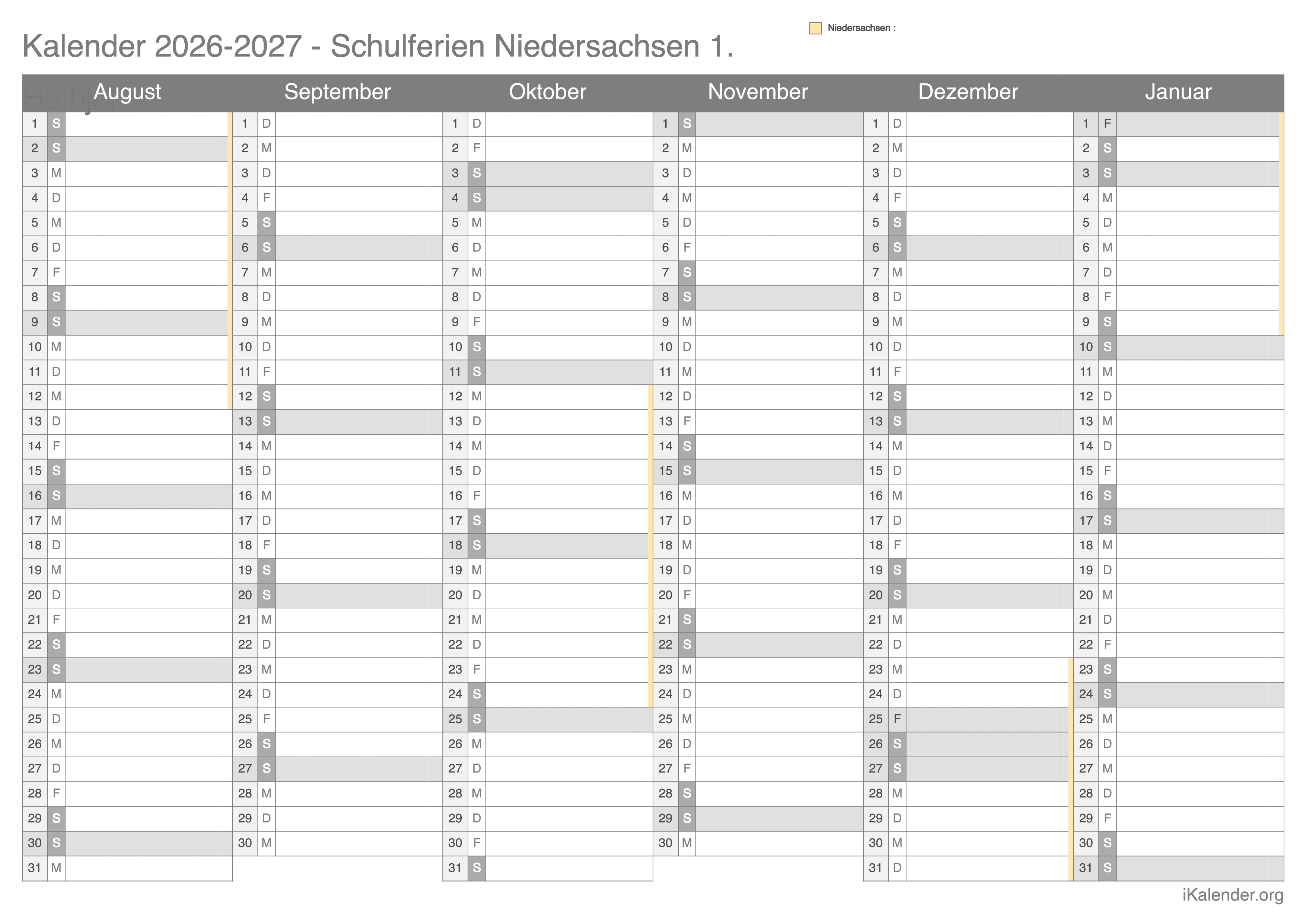 Schulferienkalender Niedersachsen 2026 - 2027 zum Ausdrucken