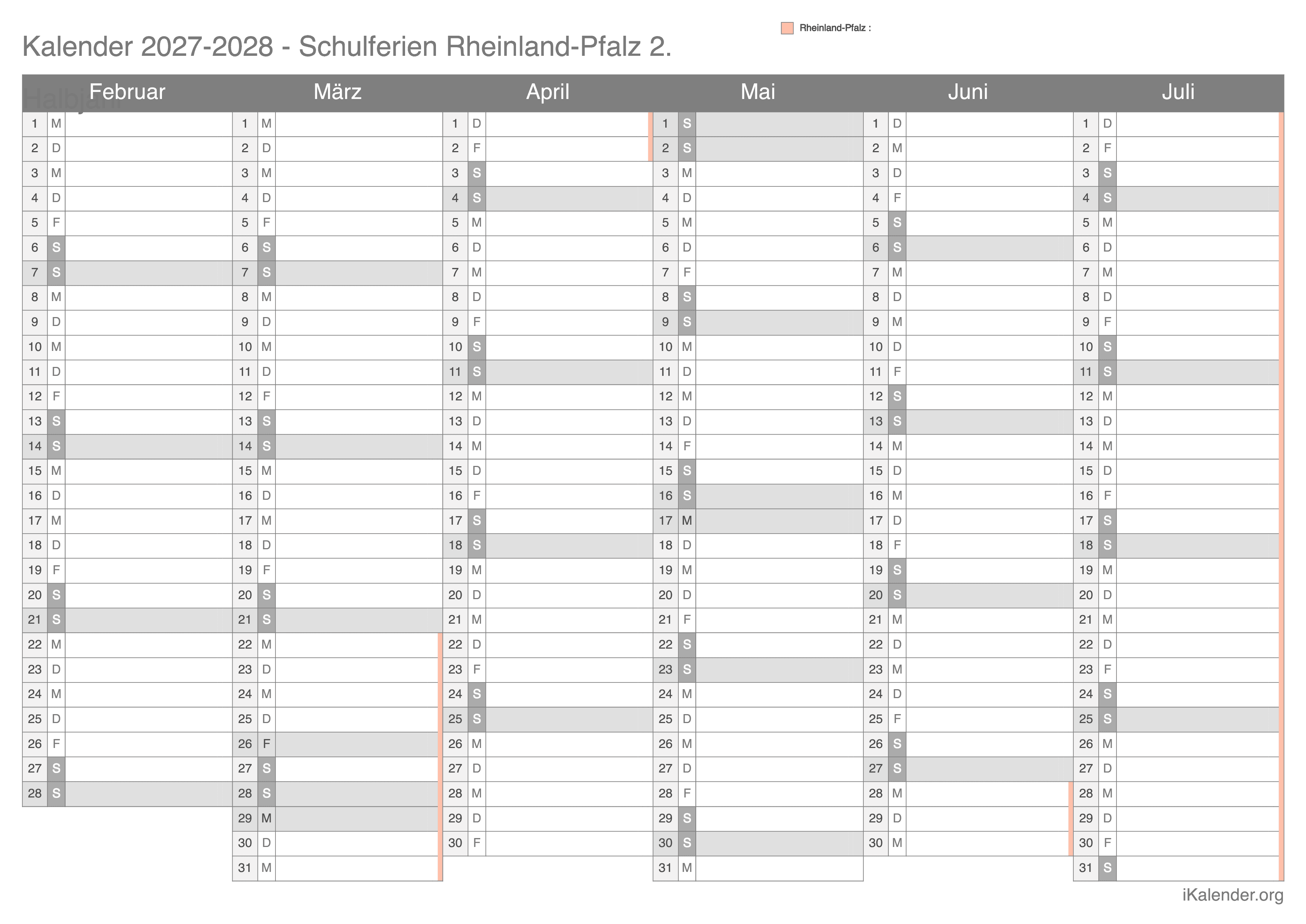 | Sommerferien 2027 | Rheinland-Pfalz | Montag, 28. Juni 2027 | Freitag, 6. August 2027 |