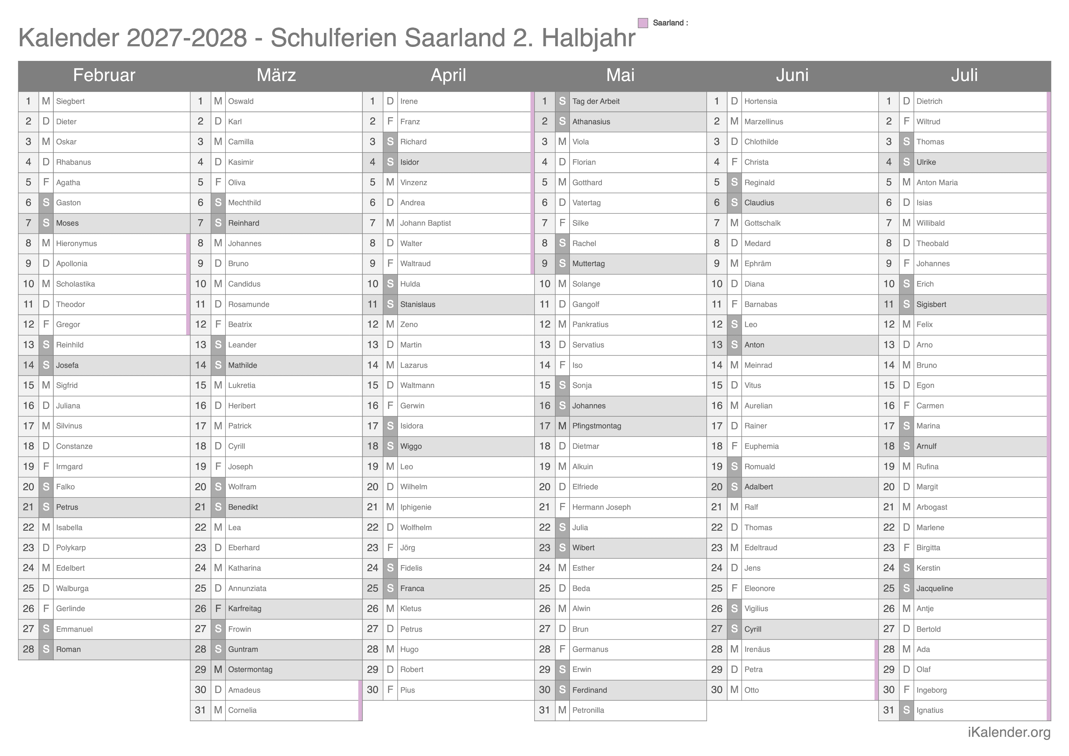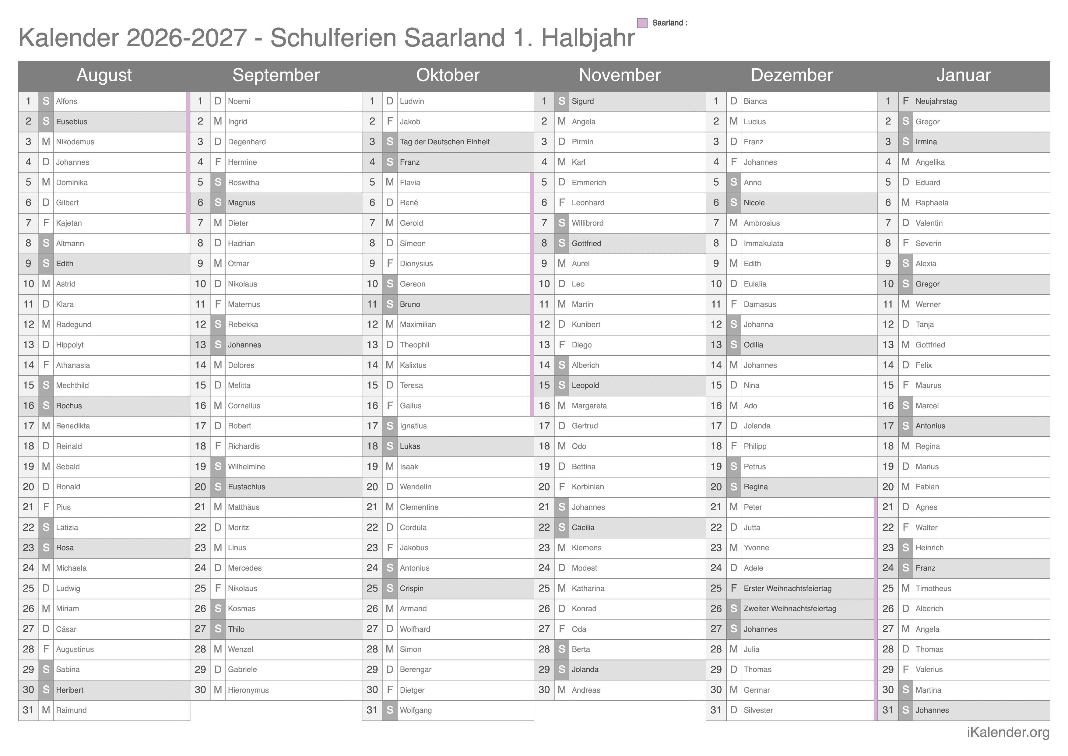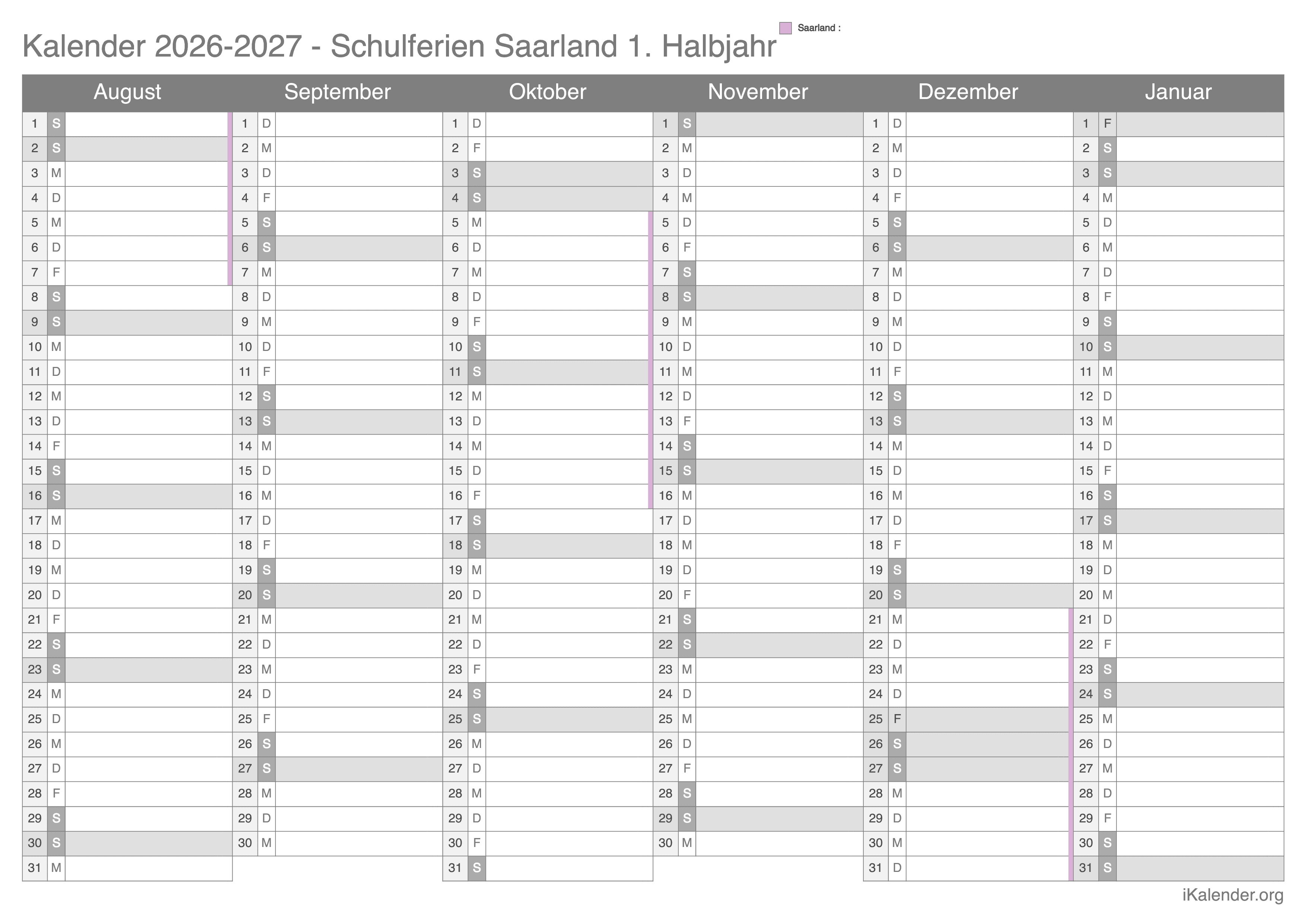 Schulferienkalender Saarland 2026 - 2027 zum Ausdrucken