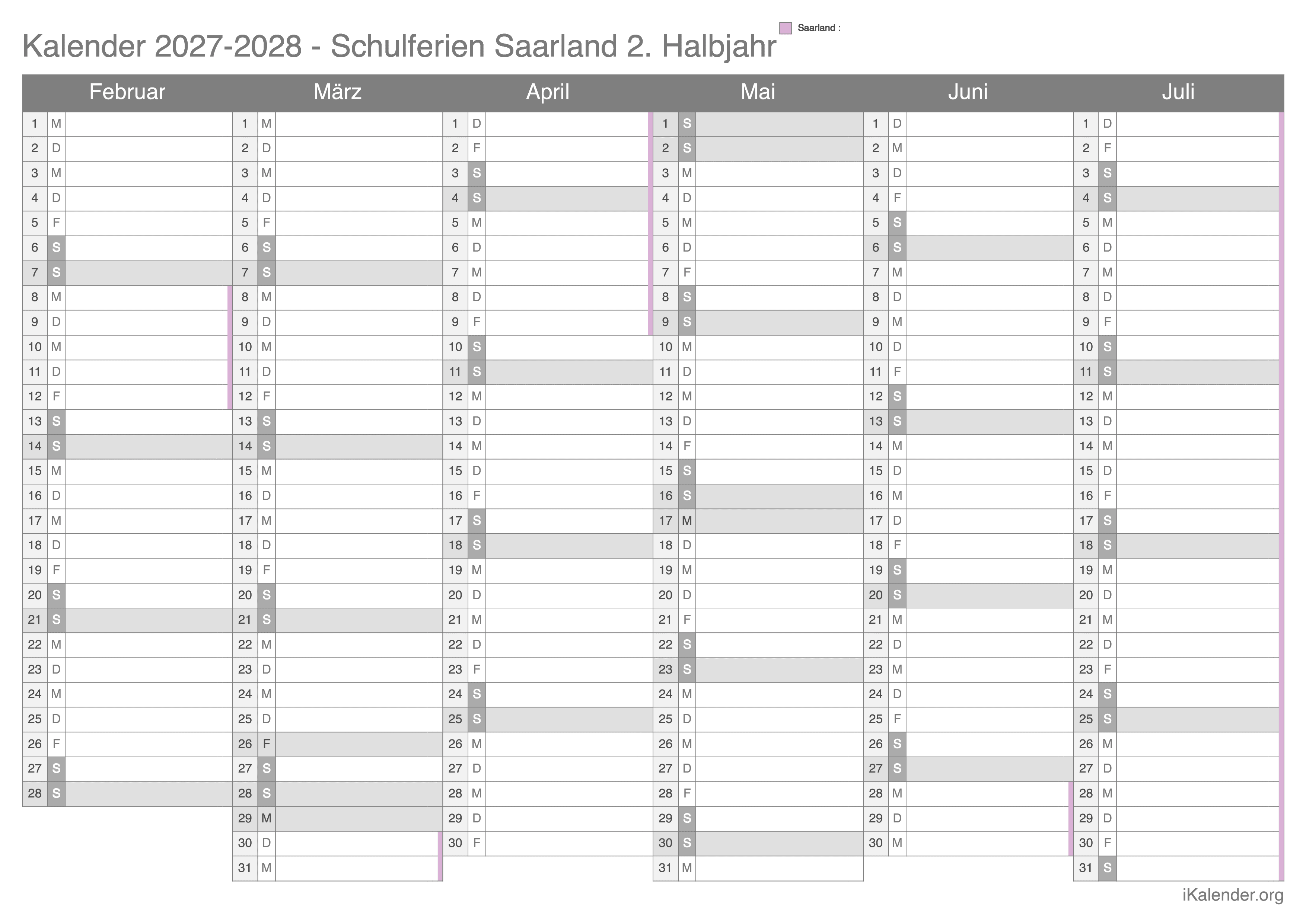 Der Kalender kann auch im Halbjahresformat heruntergeladen werden, wobei die Schulferien für jeden Monat angegeben sind.