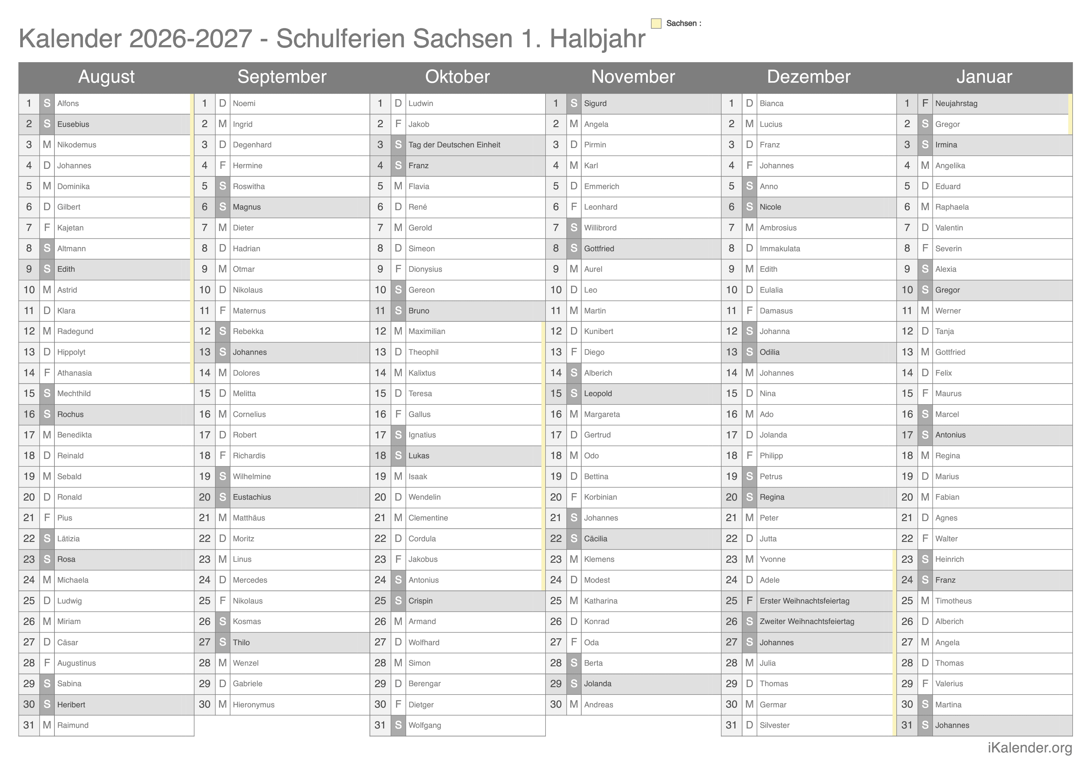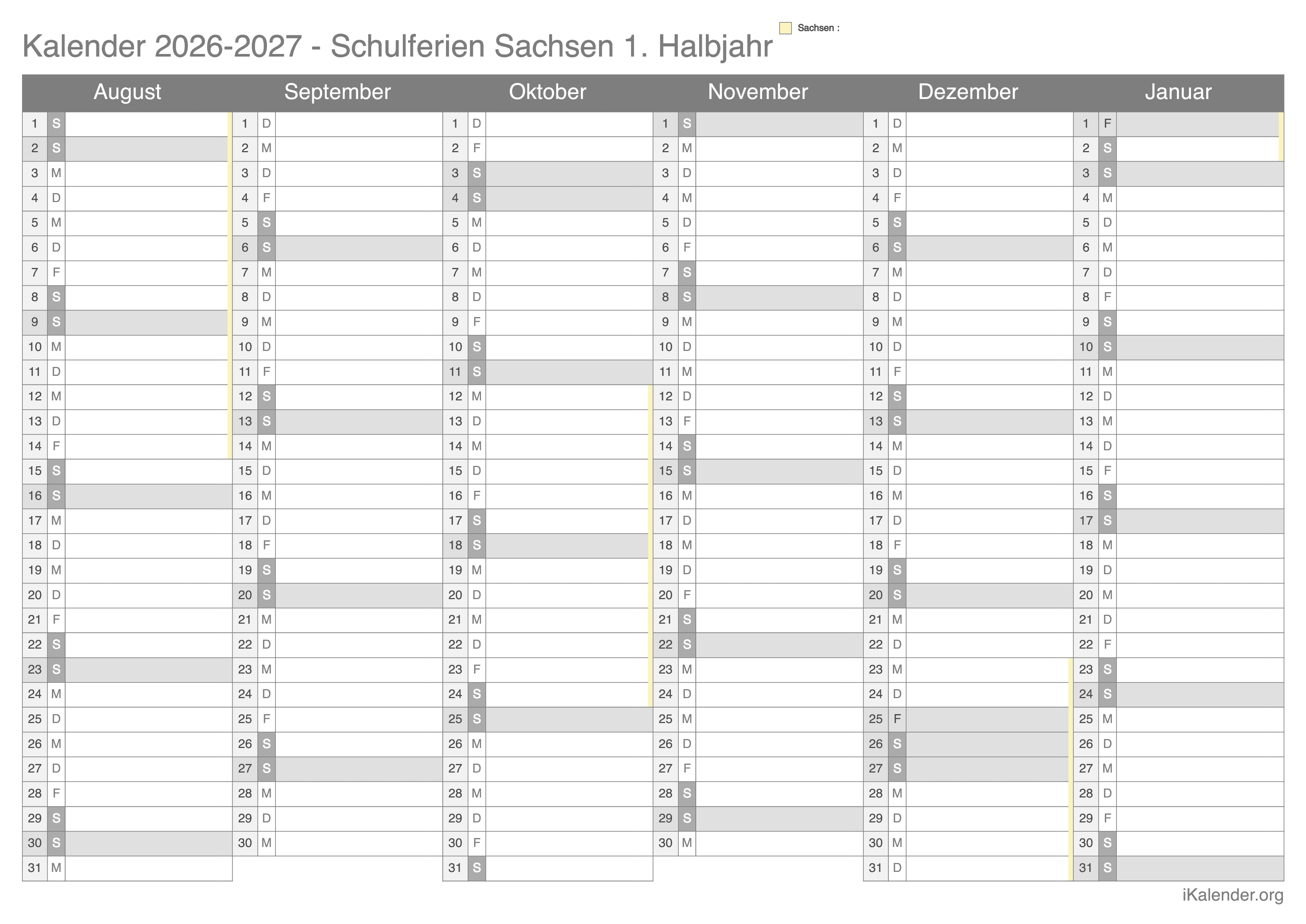 | Weihnachtsferien 2026 | Sachsen | Mittwoch, 23. Dezember 2026 | Samstag, 2. Januar 2027 |