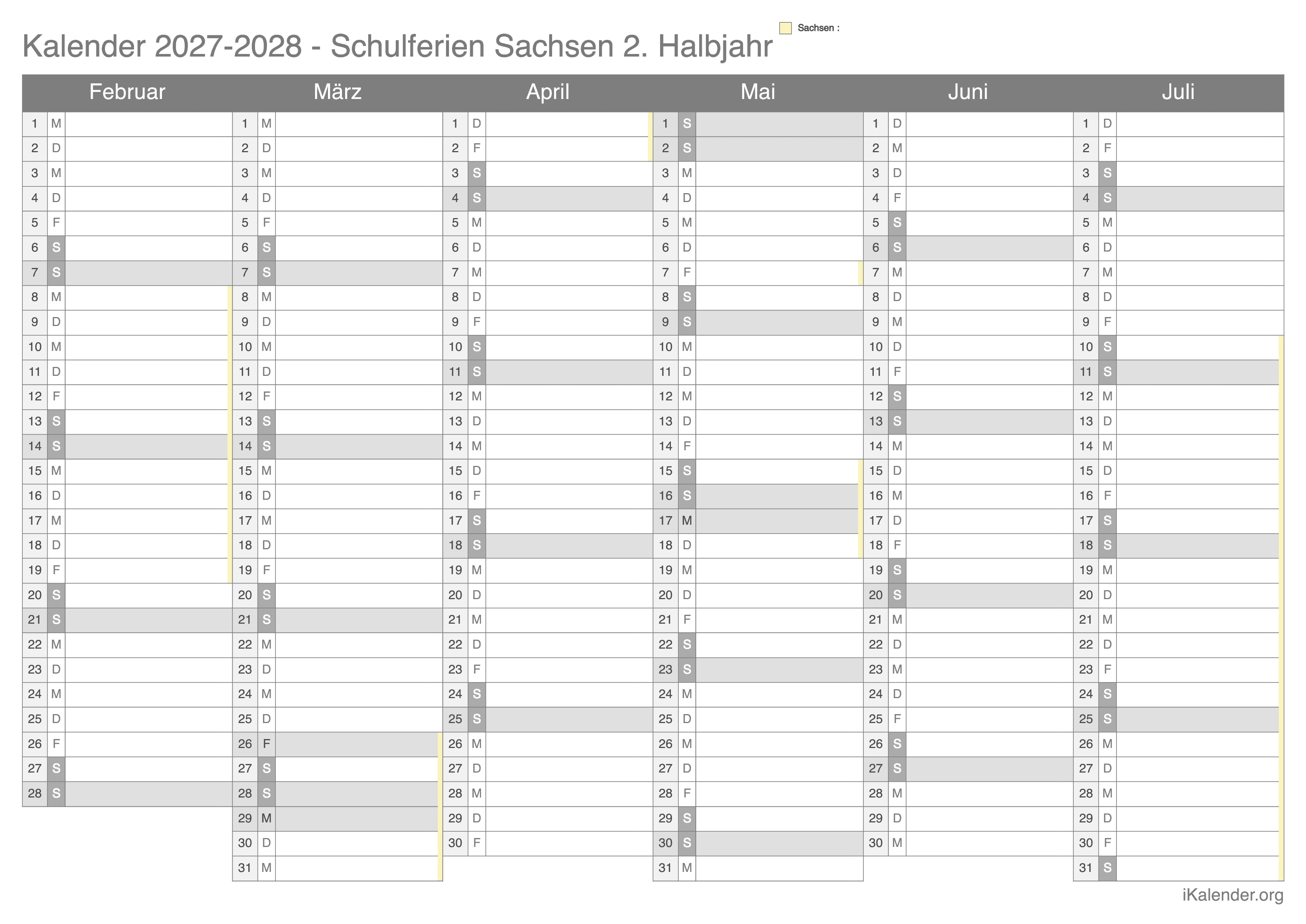 | Sommerferien 2027 | Sachsen | Samstag, 10. Juli 2027 | Freitag, 20. August 2027 |