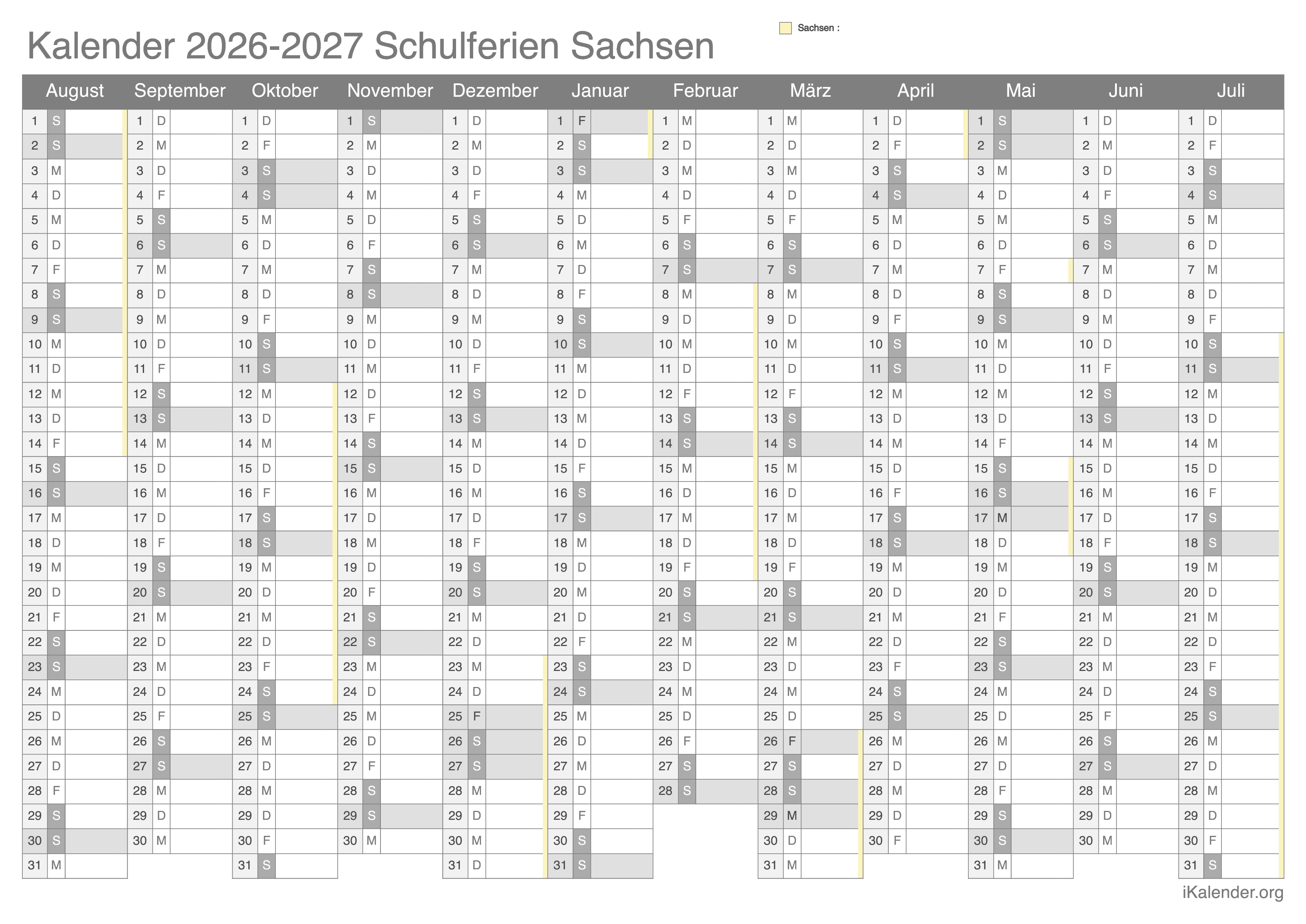 Ferientermine Sachsen Schuljahr 2026 - 2027