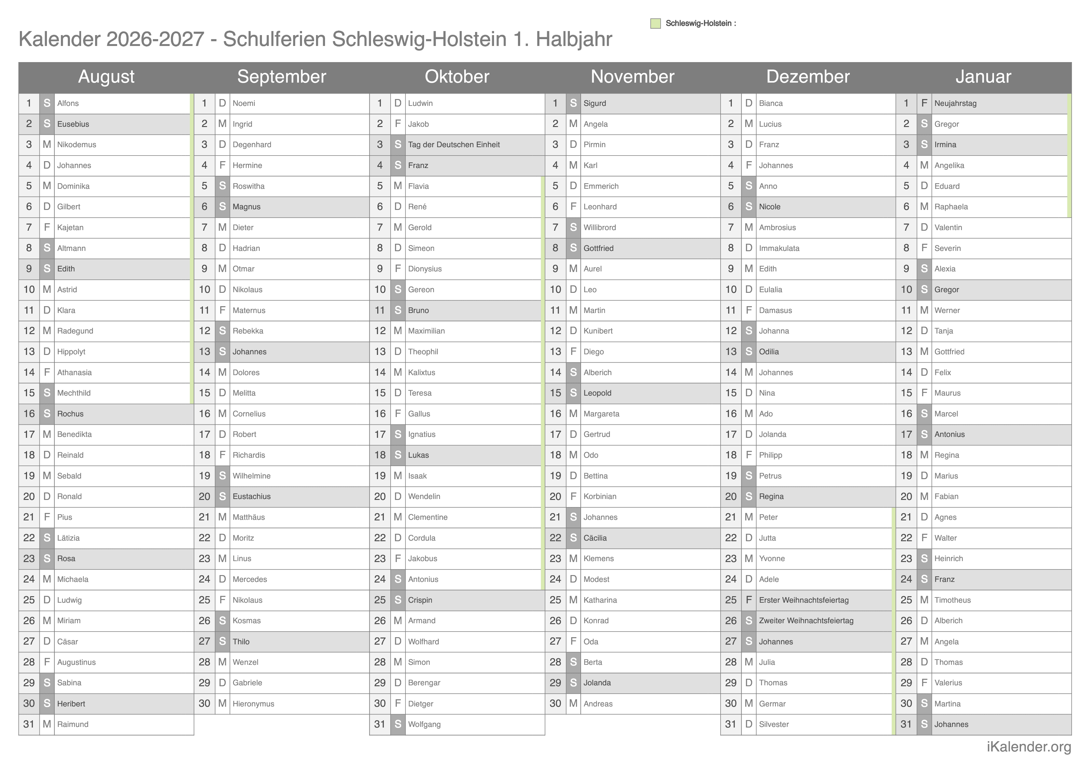 Der Kalender kann auch im Halbjahresformat heruntergeladen werden, wobei die Schulferien für jeden Monat angegeben sind.