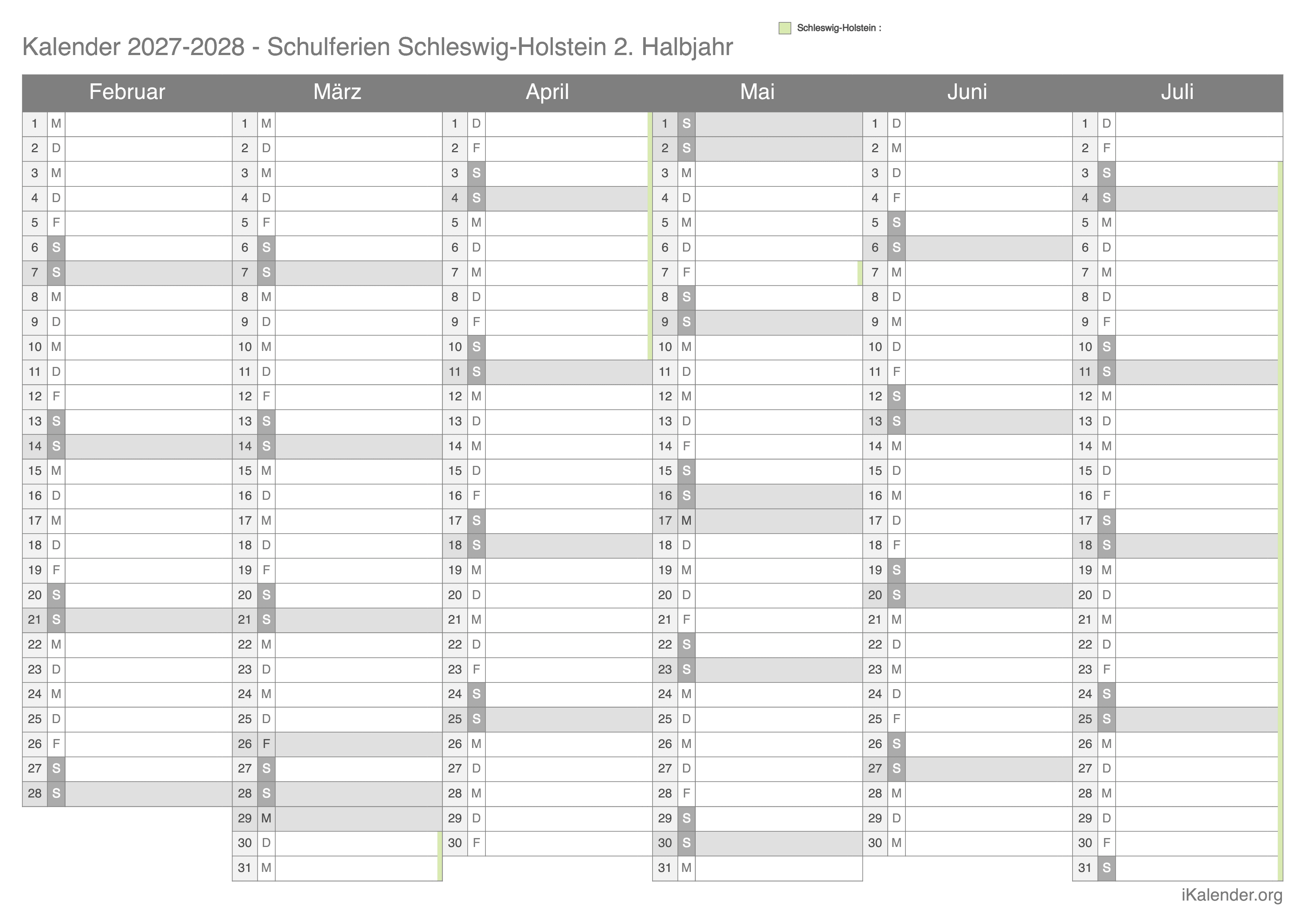 | Sommerferien 2027 | Schleswig-Holstein | Samstag, 3. Juli 2027 | Samstag, 14. August 2027 |