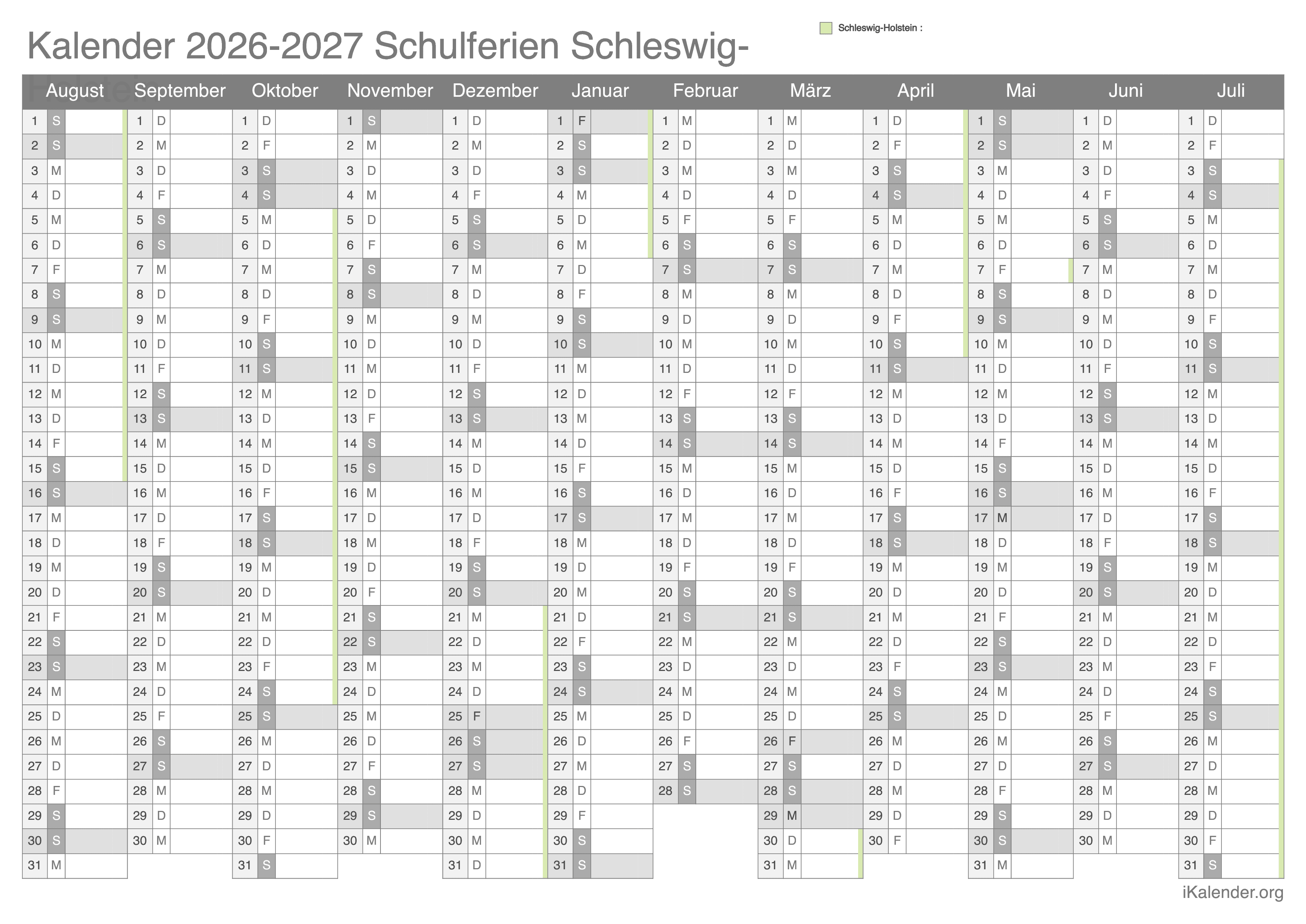 Schulferienkalender Schleswig-Holstein 2026 - 2027 zum Ausdrucken